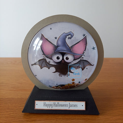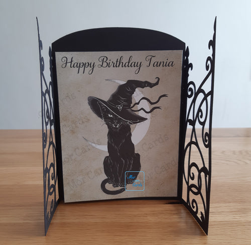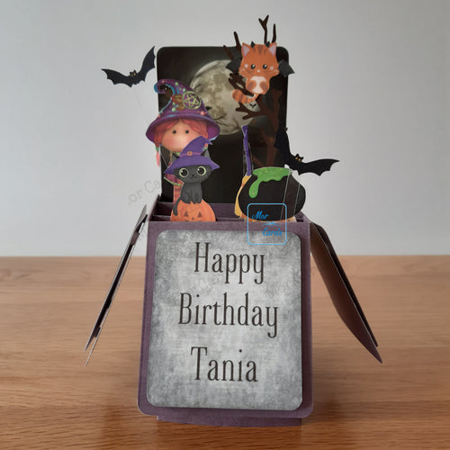 Magic wand exploding box card, with Book of Shadows, Witch's cat & hat