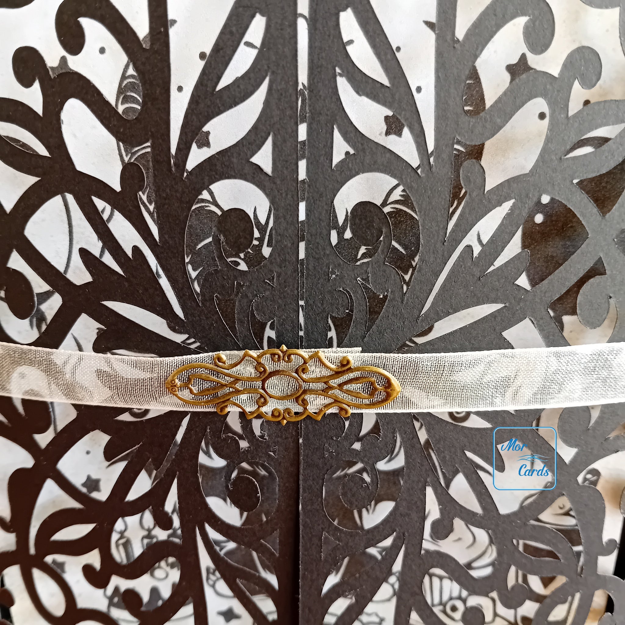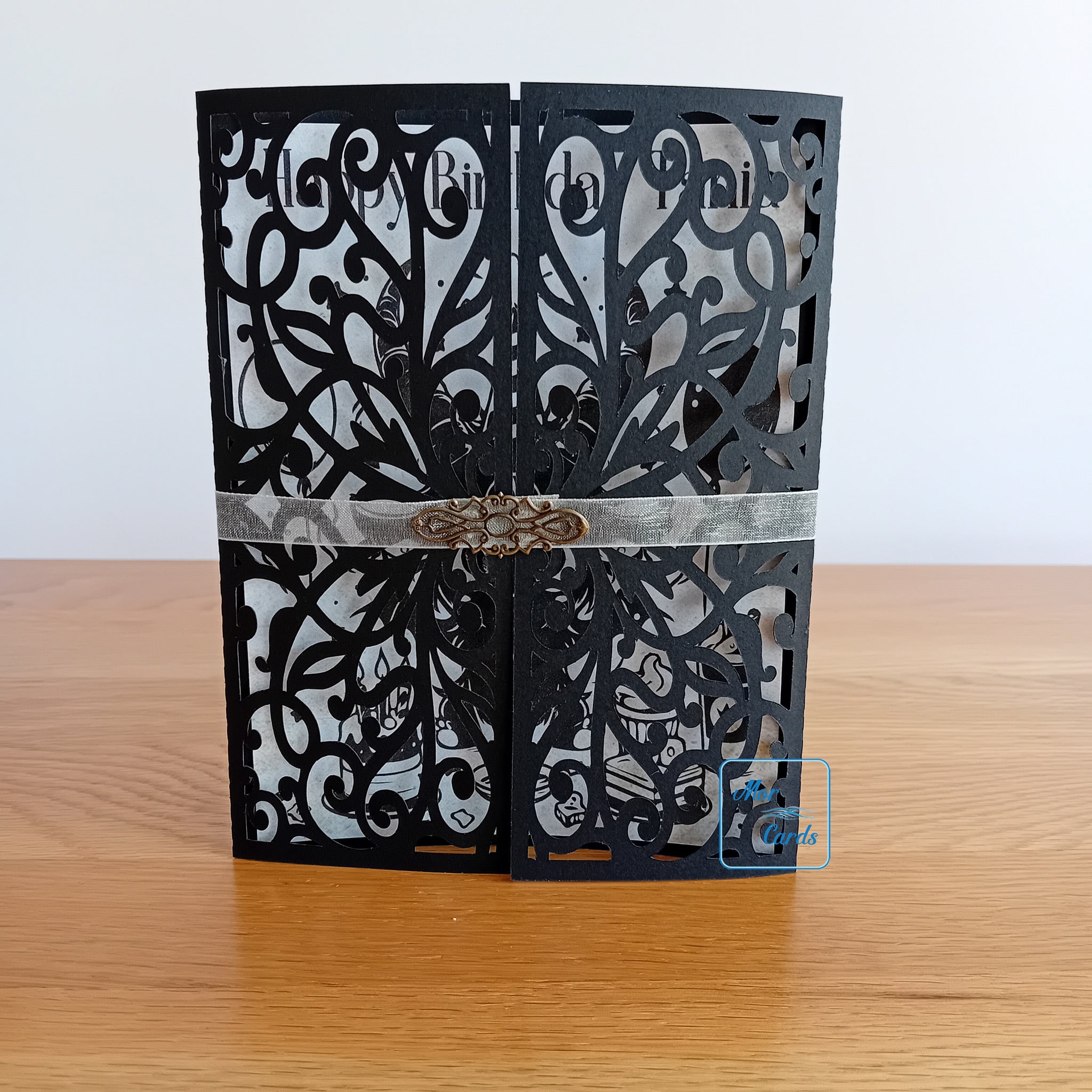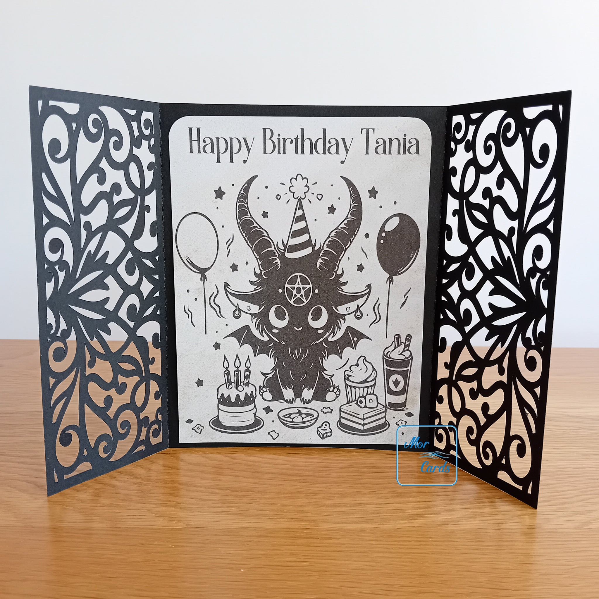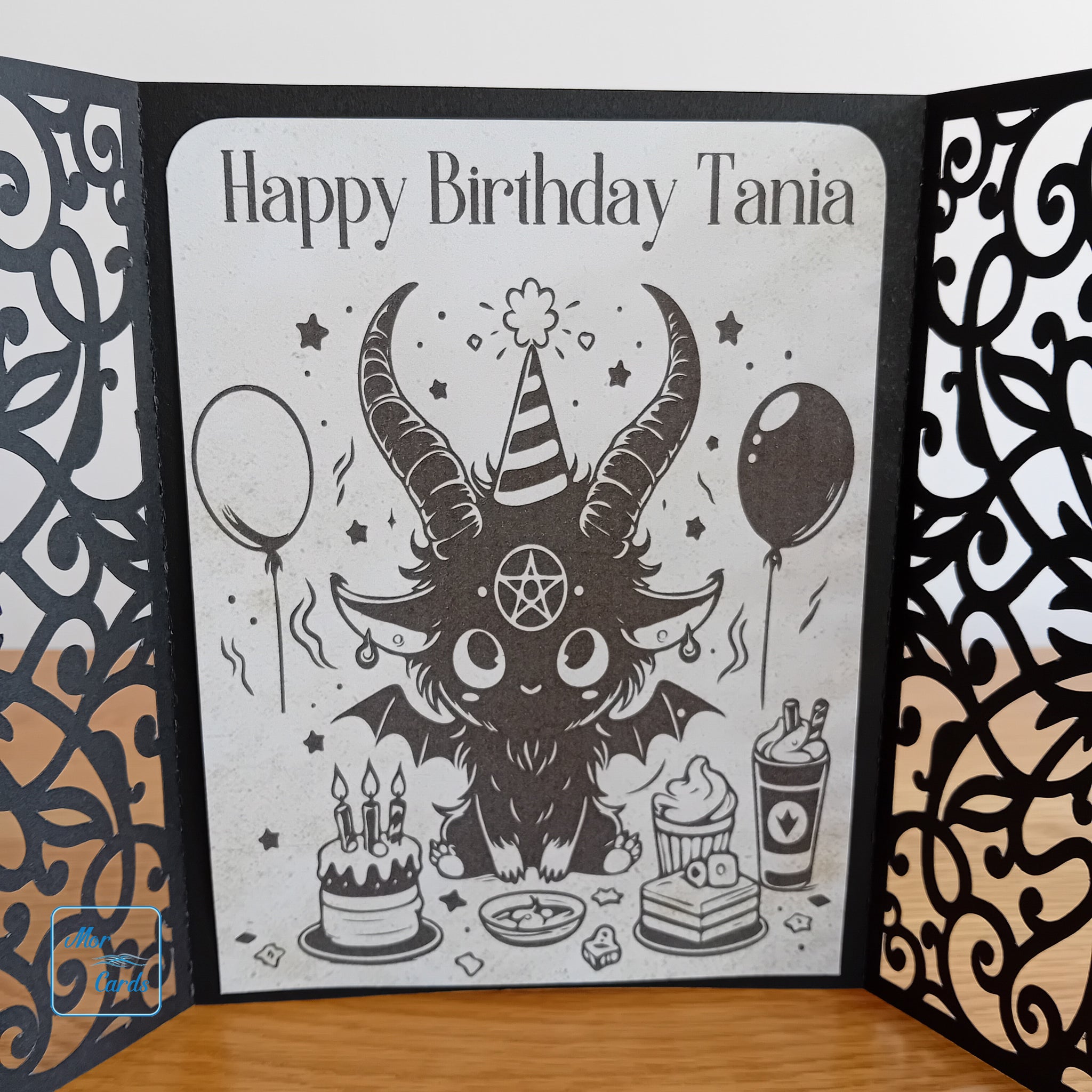This is a personalised, handmade gatefold card with an ornate ribbon decoration. It shows Baphomet having a party and can be personalised.