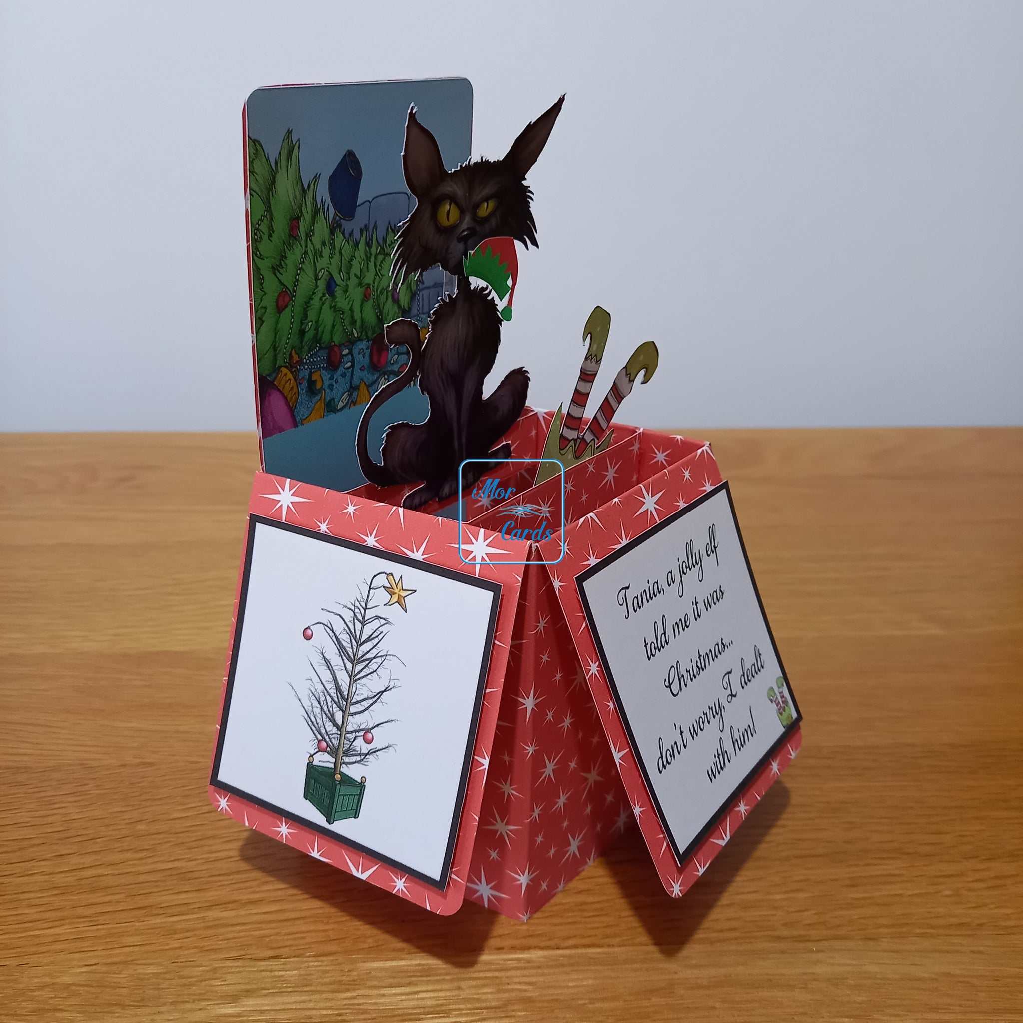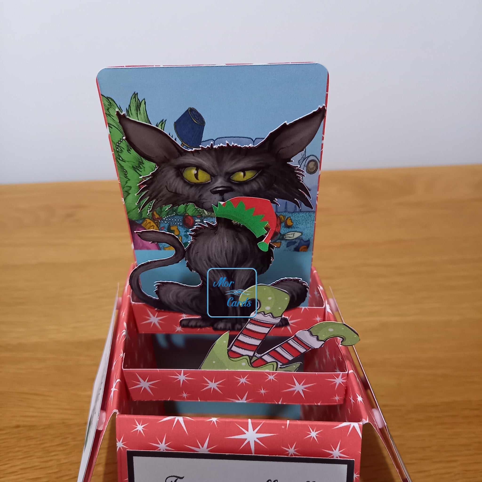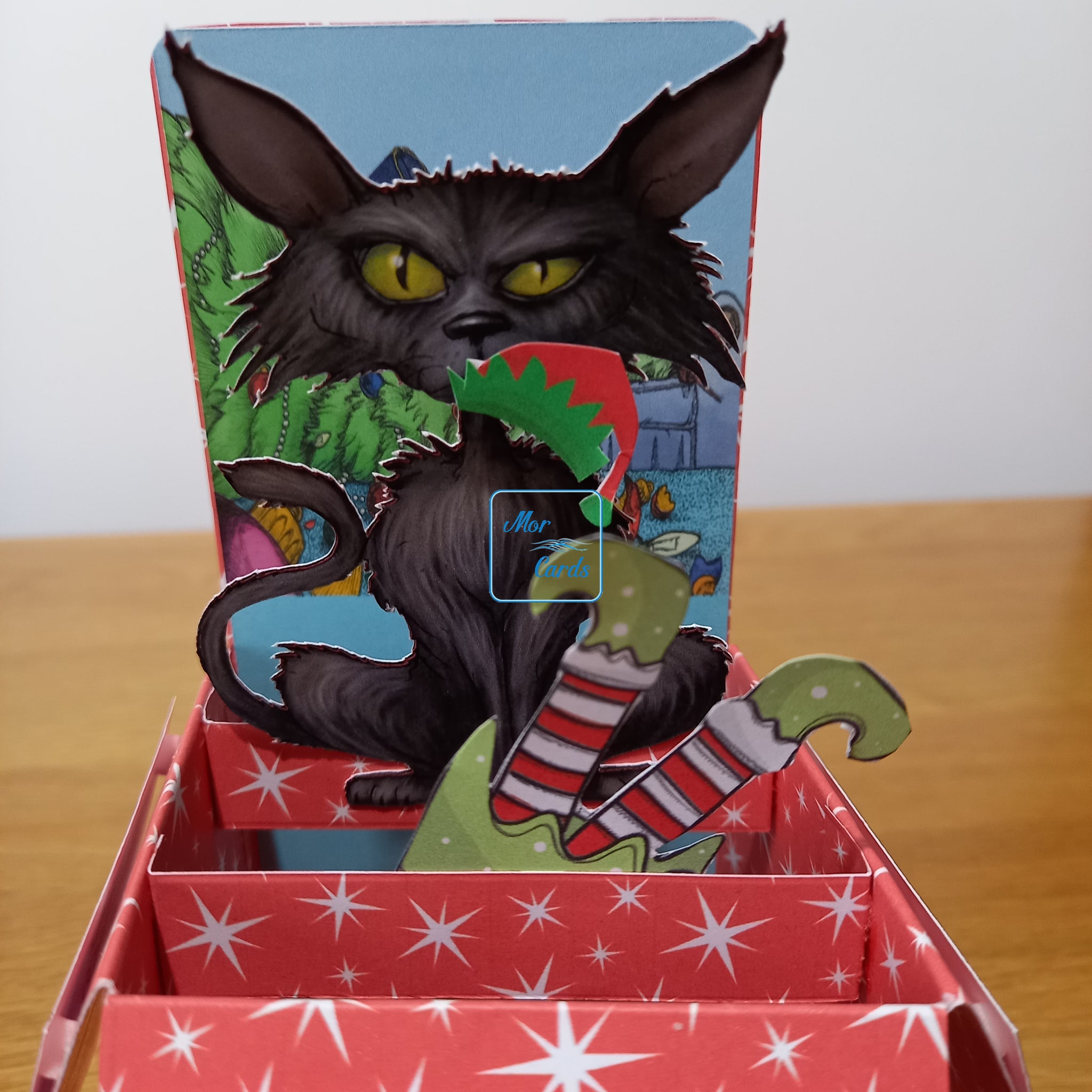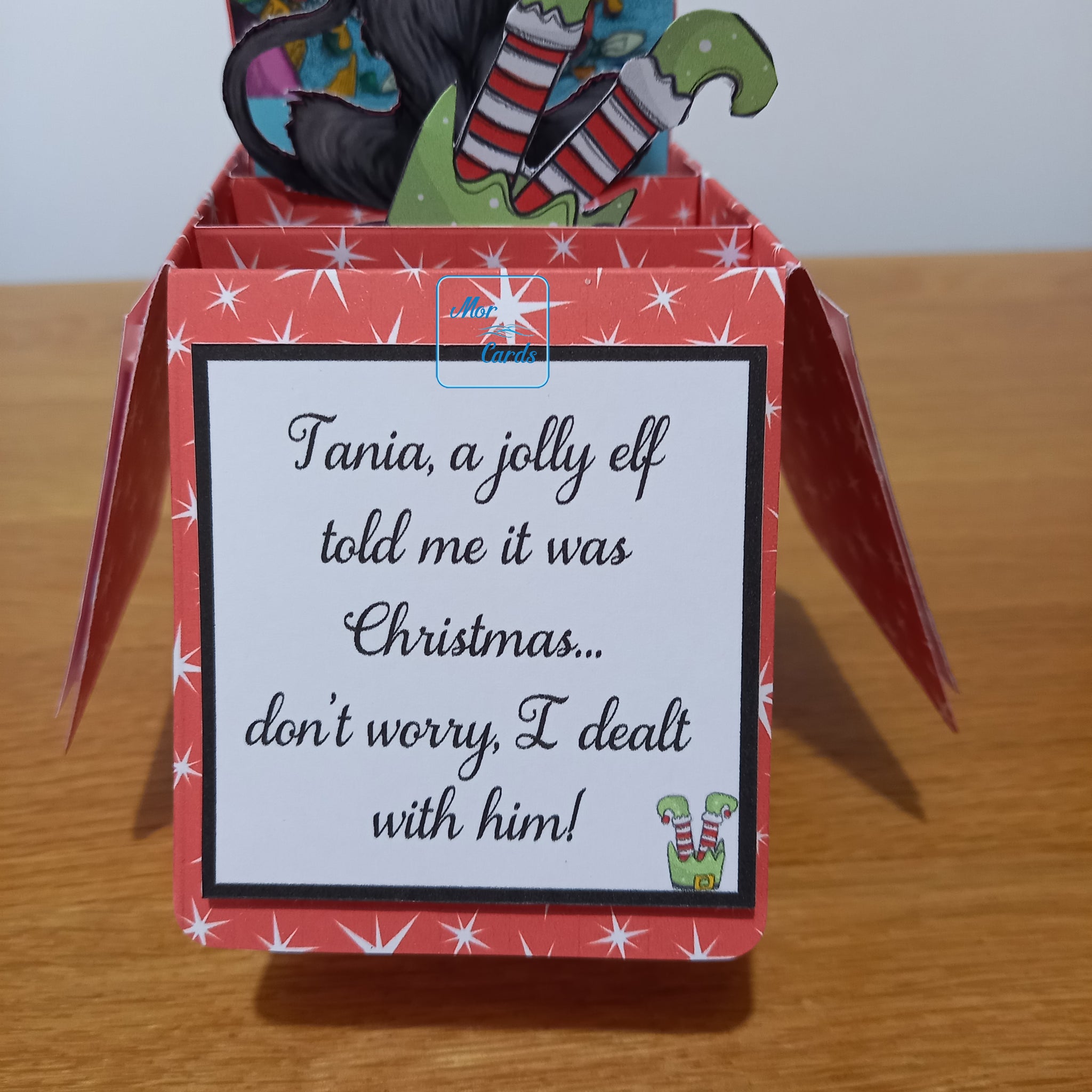 This is a ‘pop up’ box card with a bad cat who has eaten a festive elf - it can be personalised with a name if required.