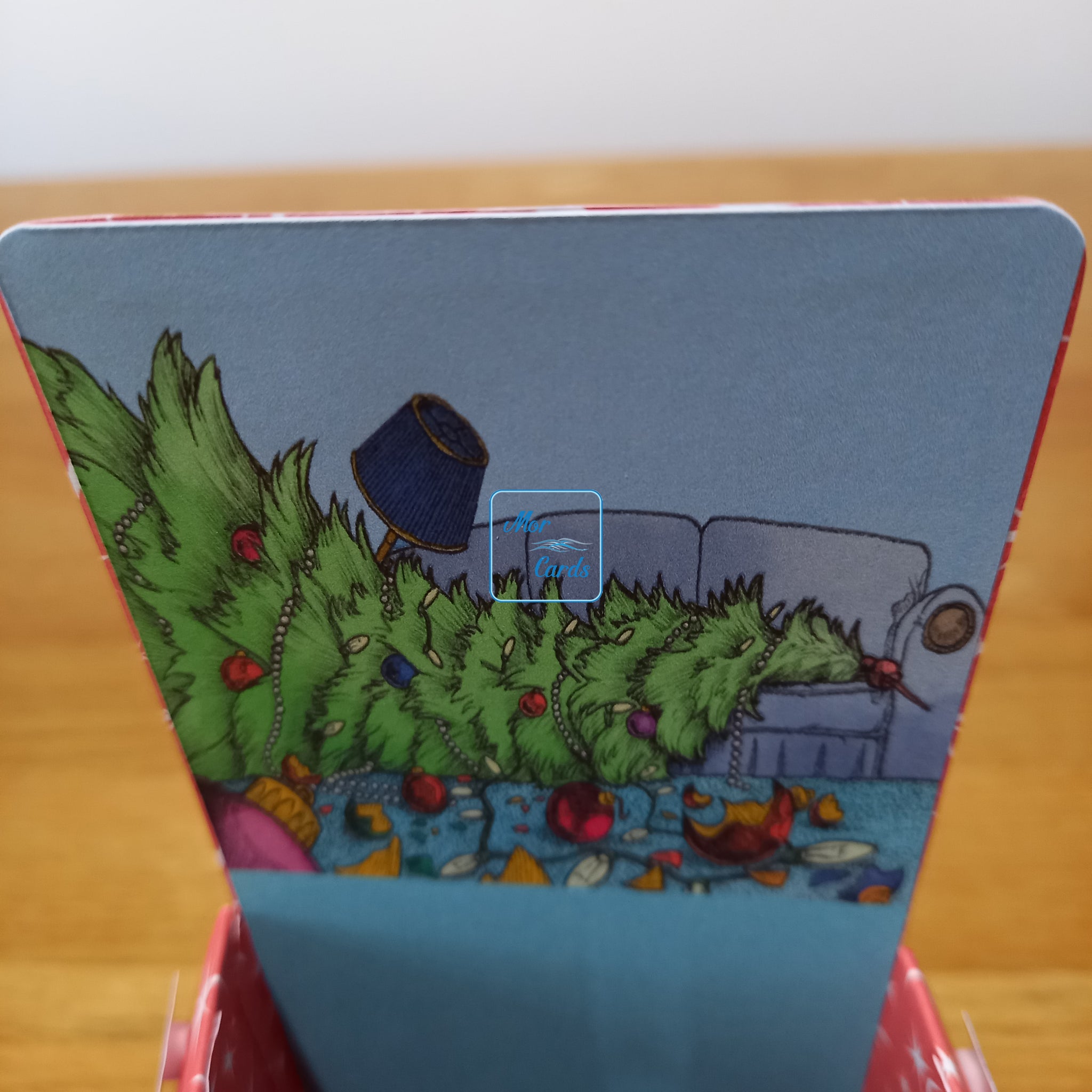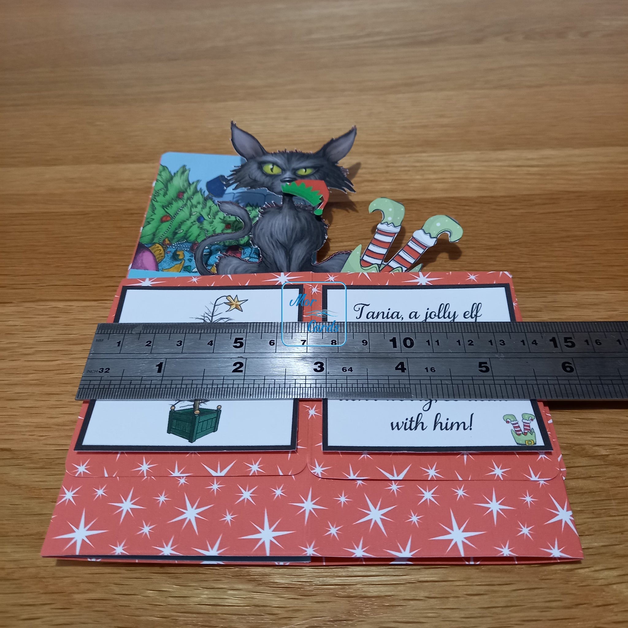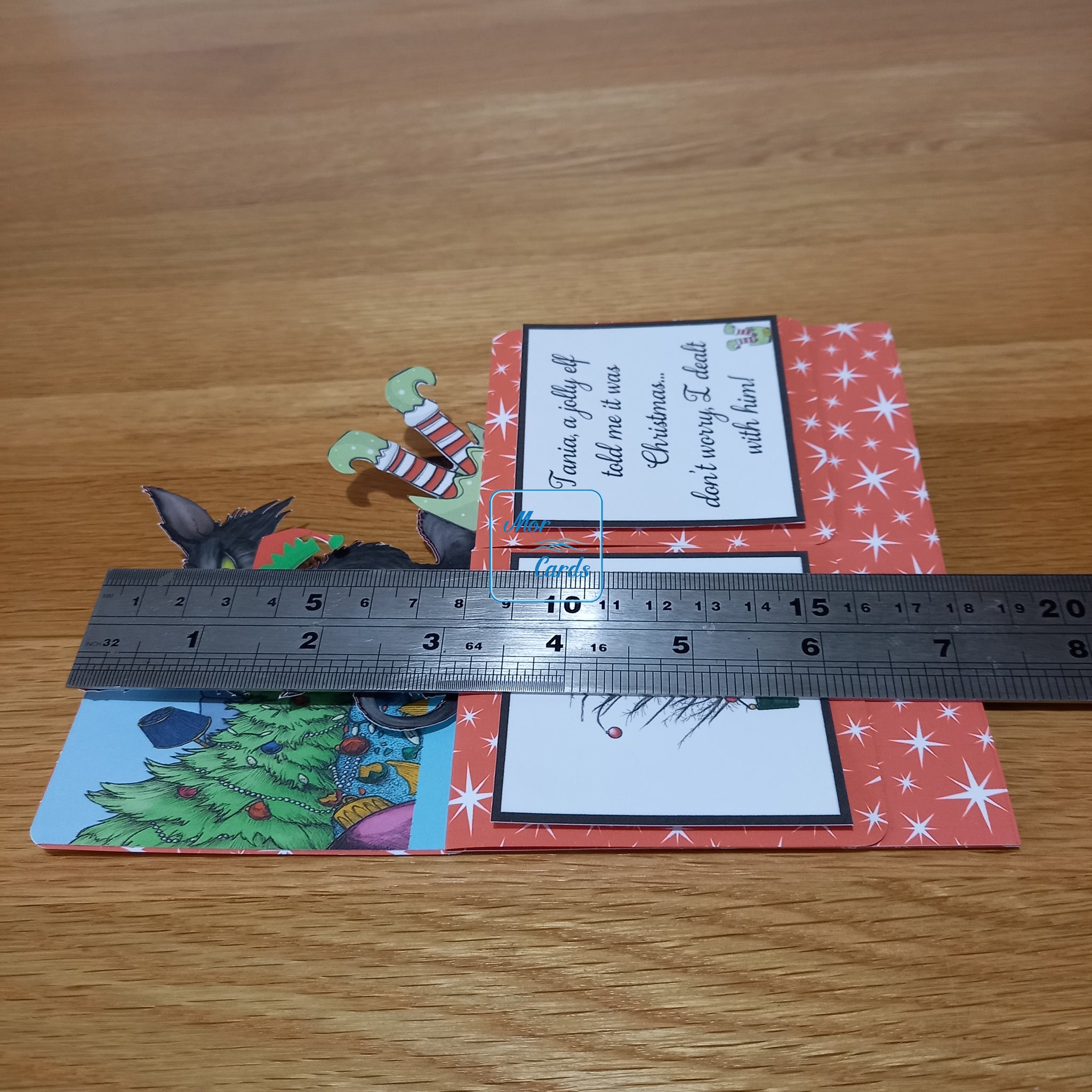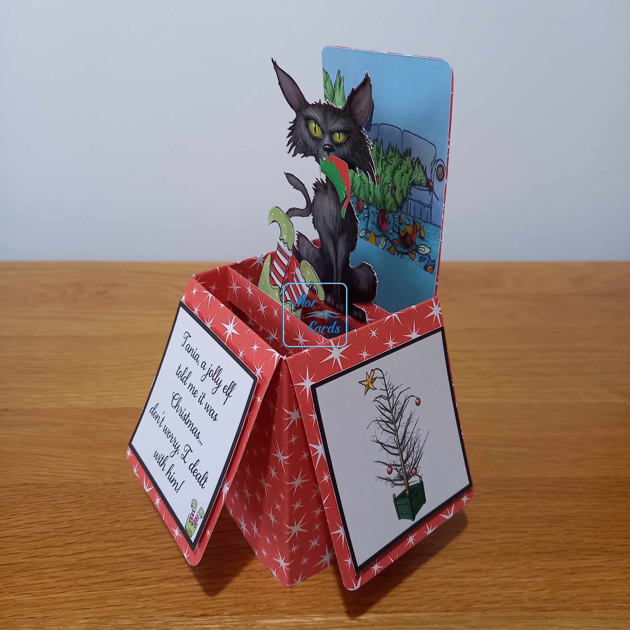 This is a ‘pop up’ box card with a bad cat who has eaten a festive elf - it can be personalised with a name if required.