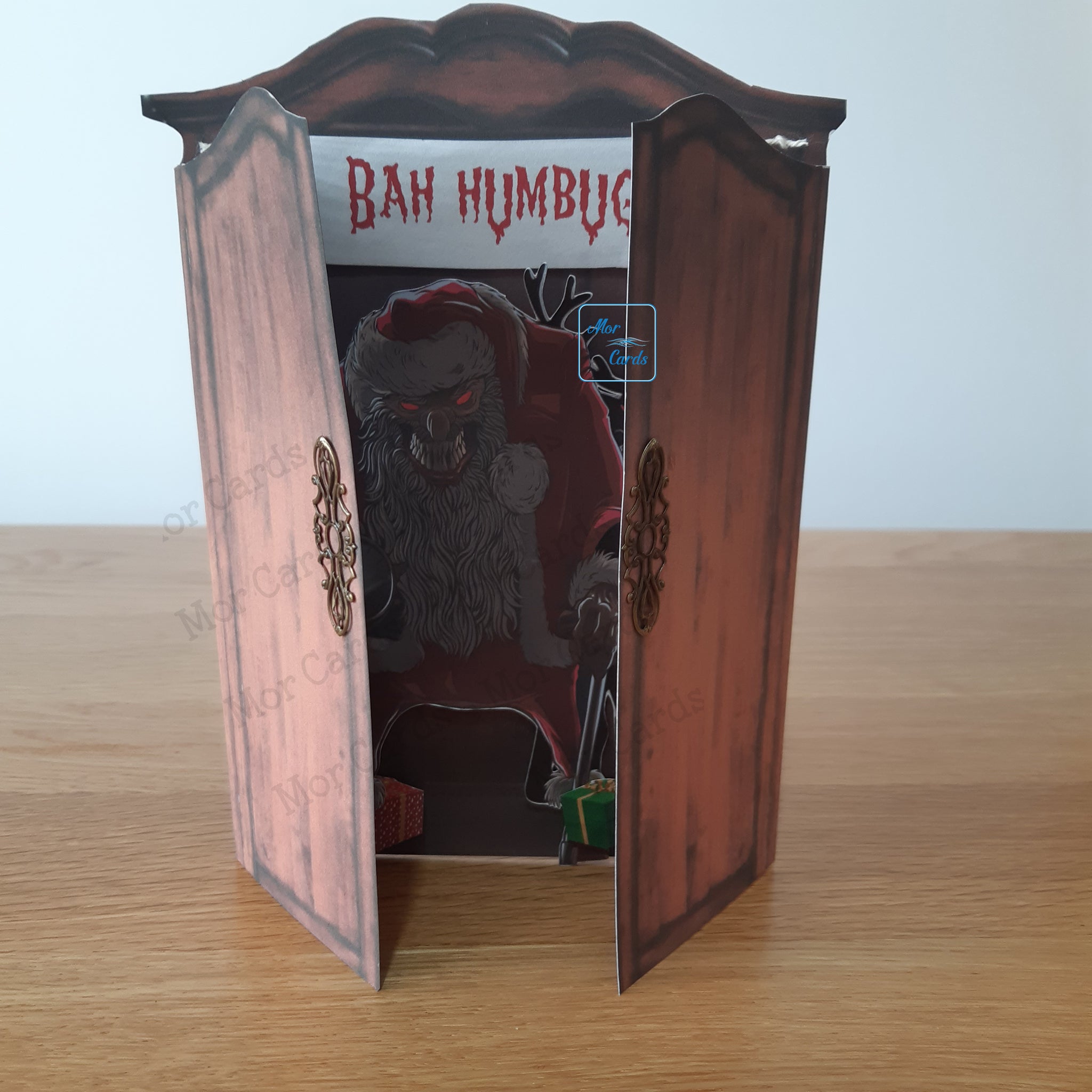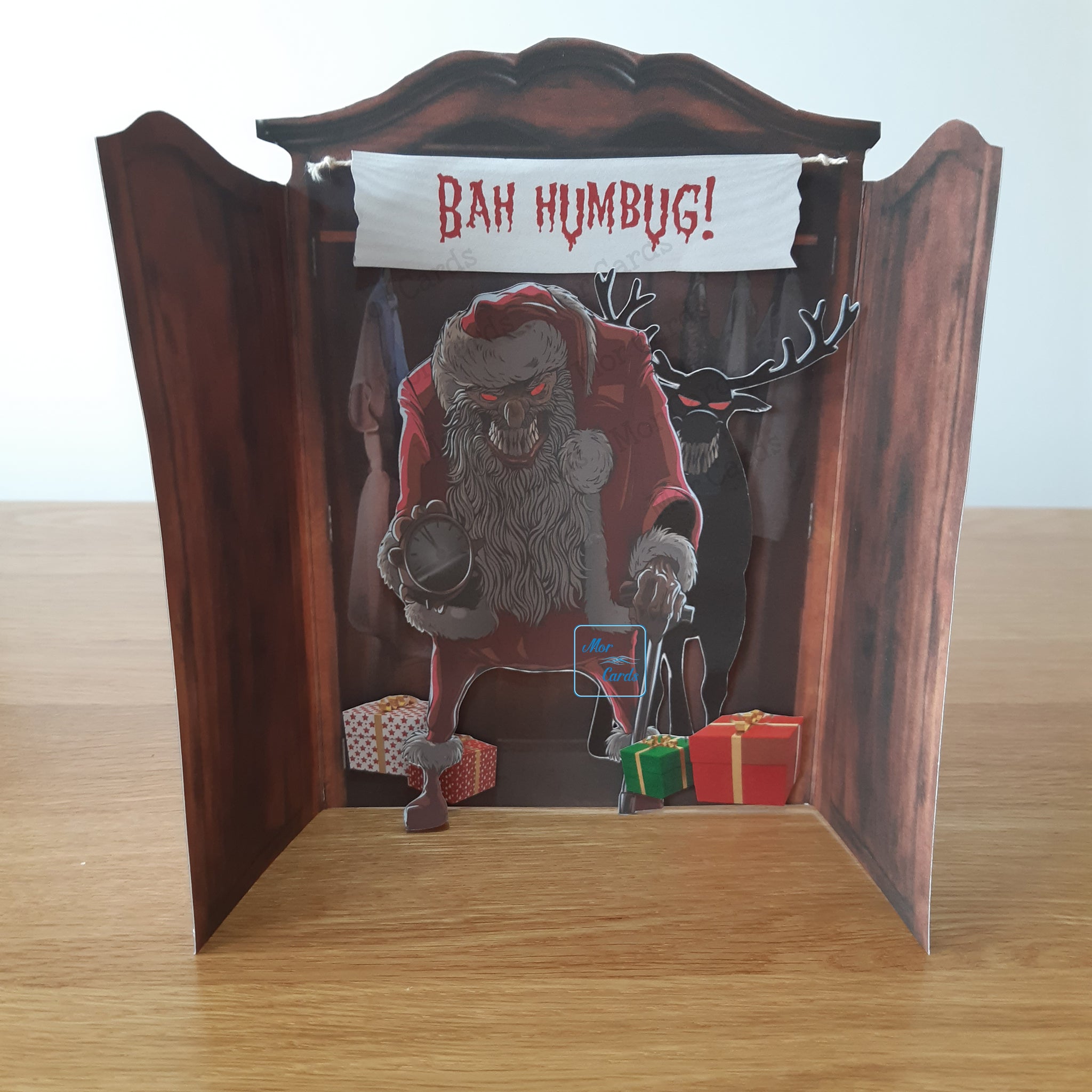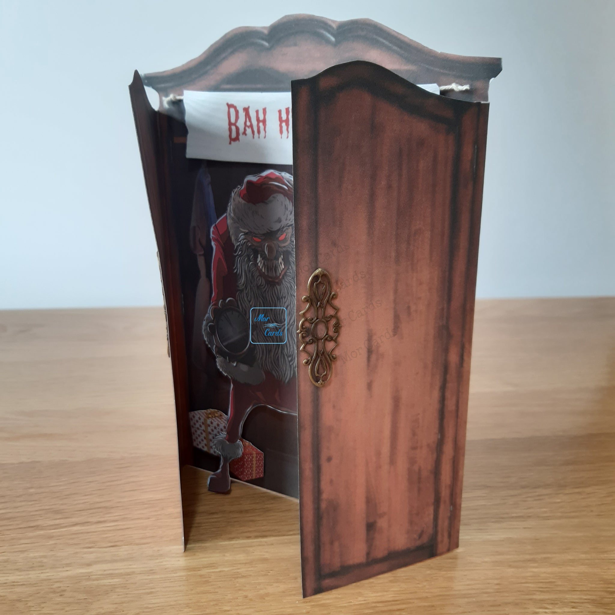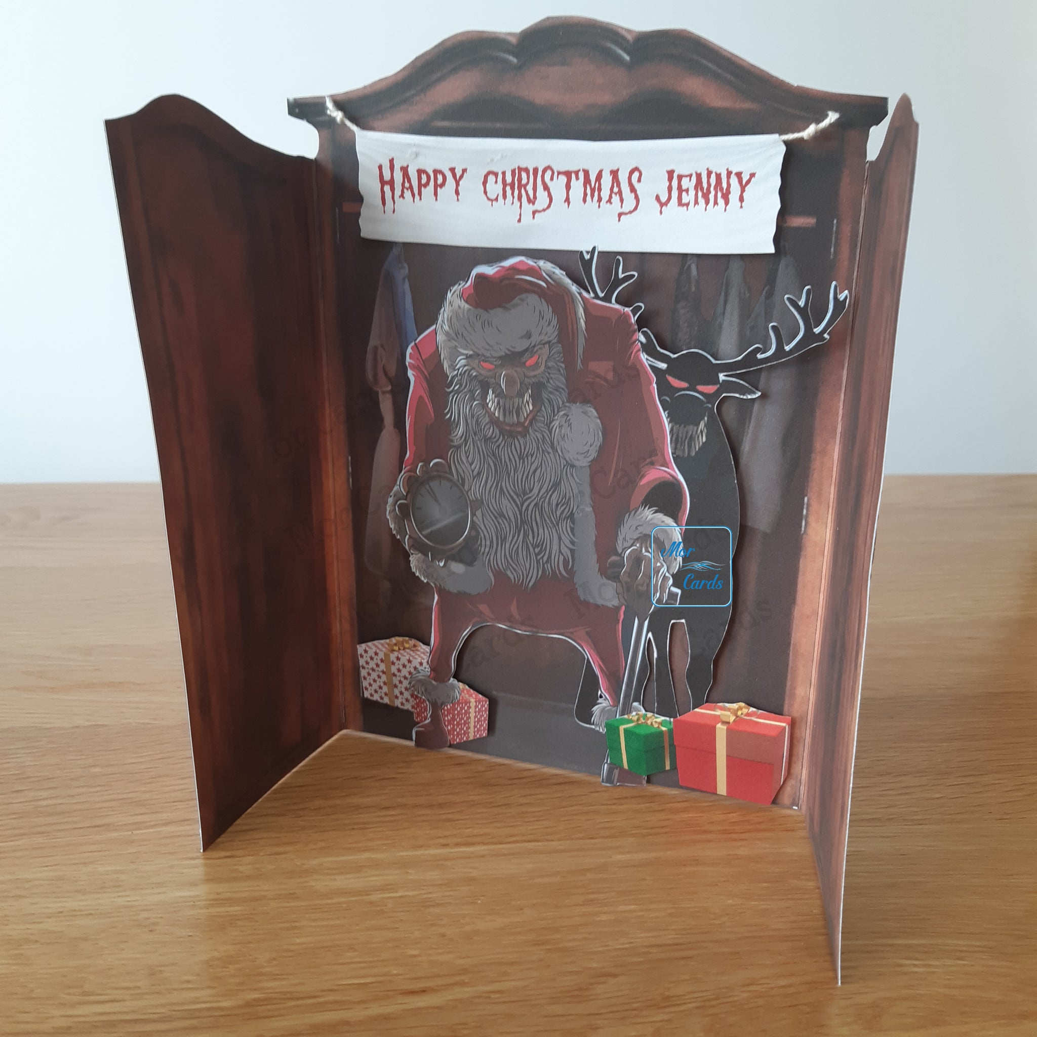 Scary closet / wardrobe card with a bad, evil Santa hiding inside to surprise you. Perfect for any Gothic, alternative or horror fan for a fun surprise.