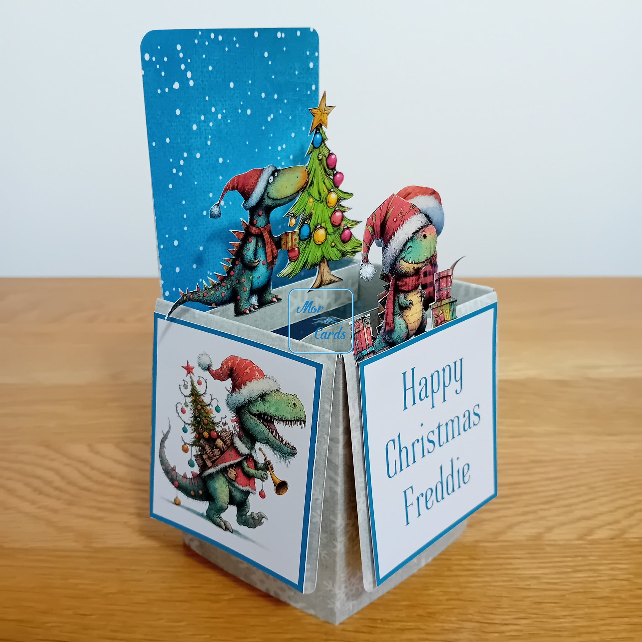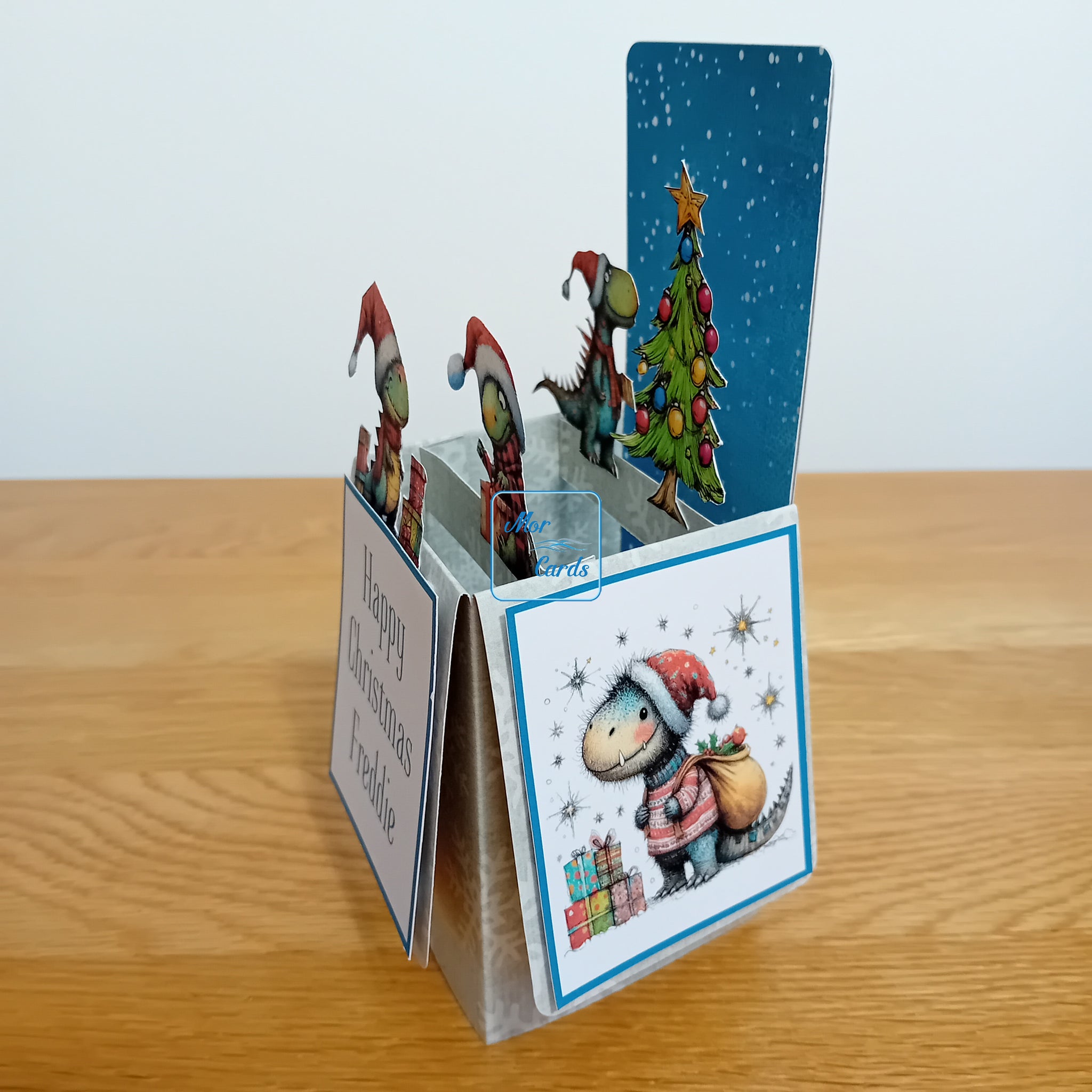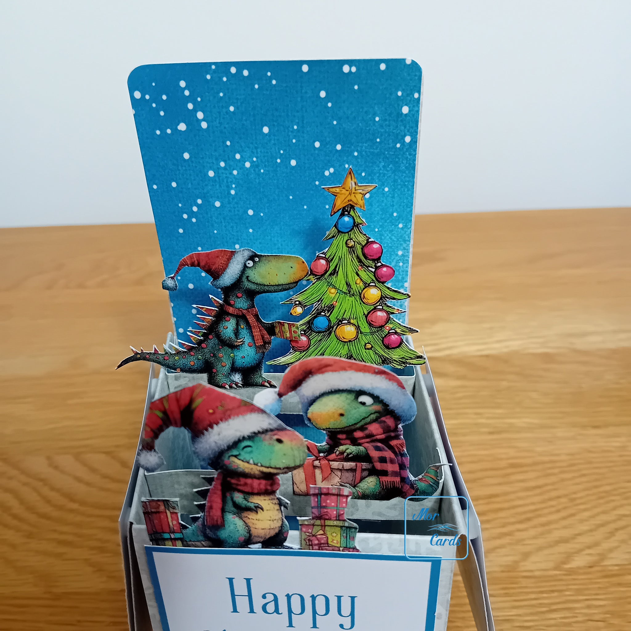 This is an alternative Christmas 'pop up’ box card with Christmas dinosaurs.