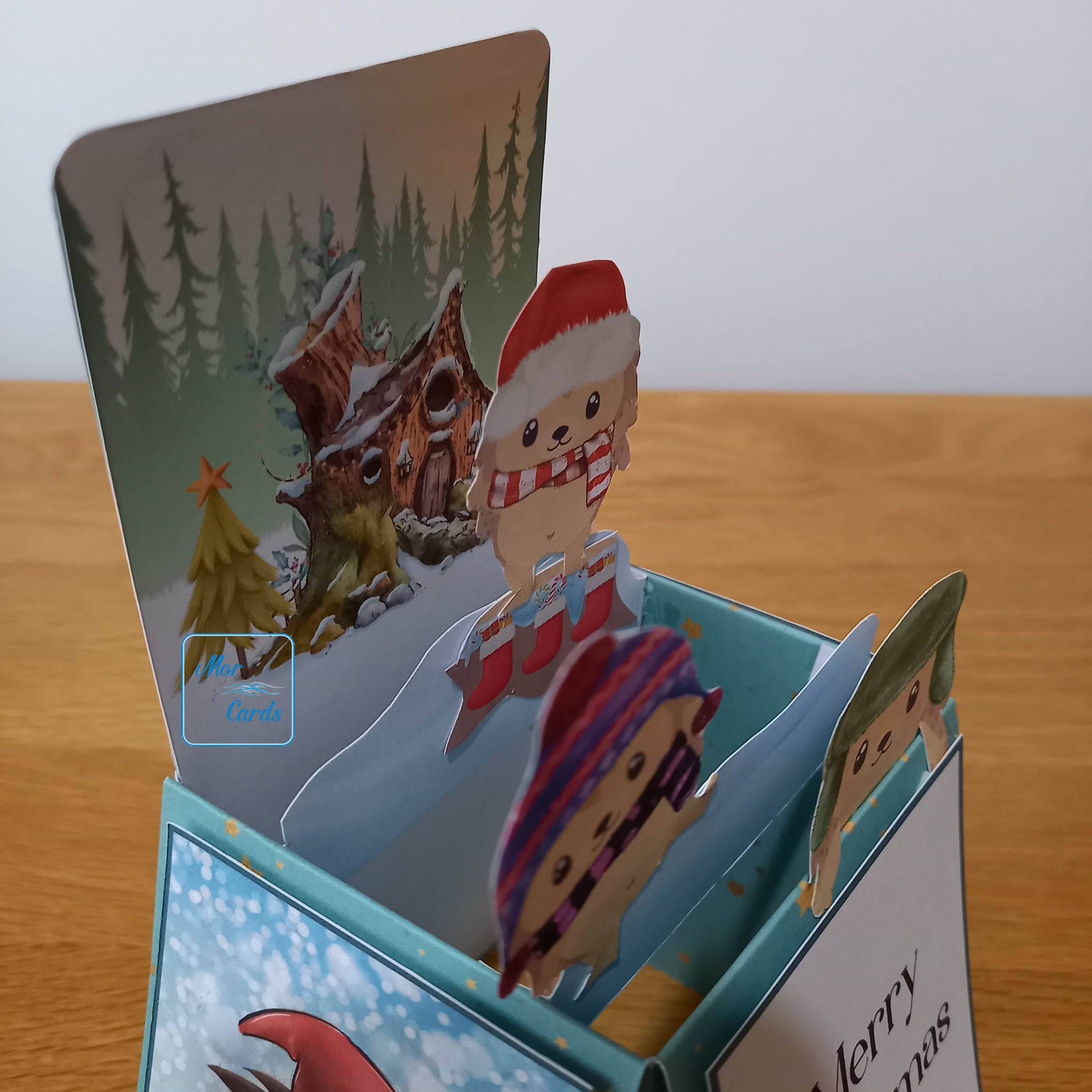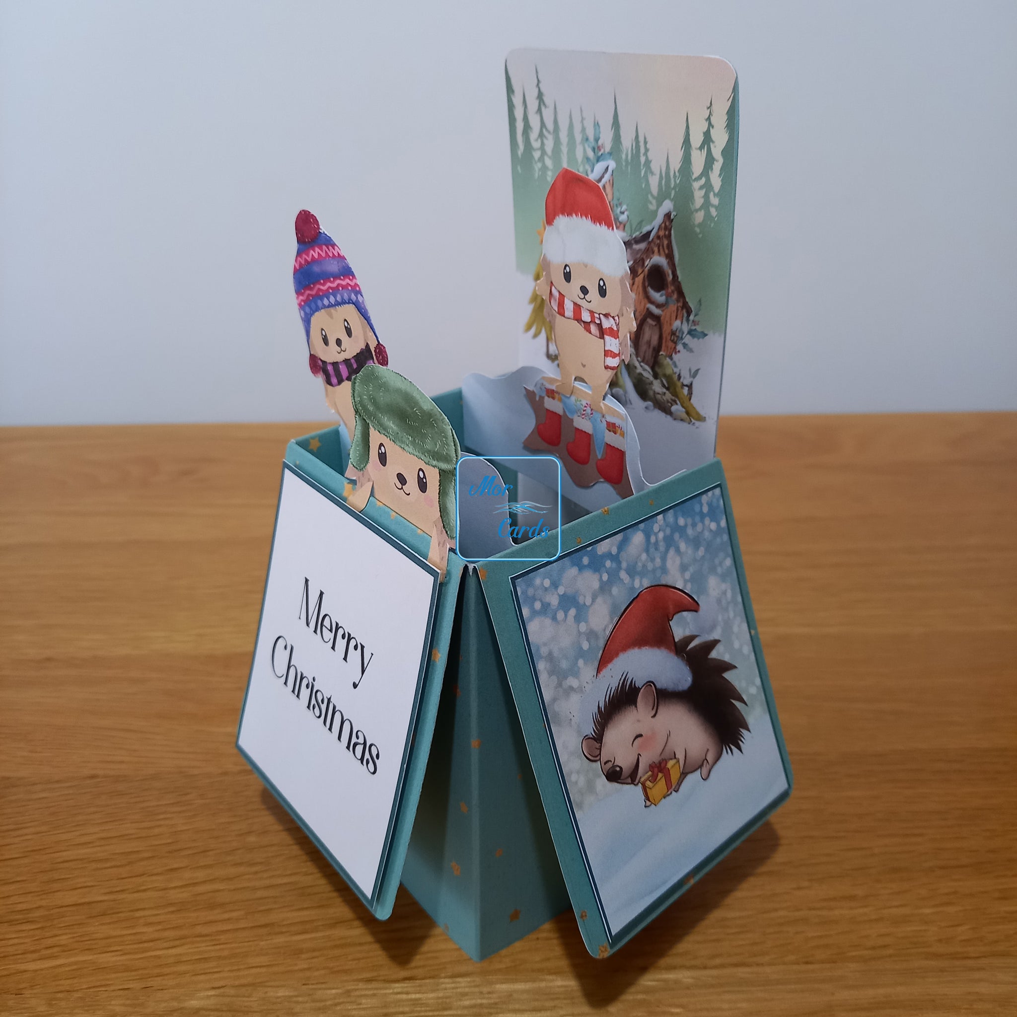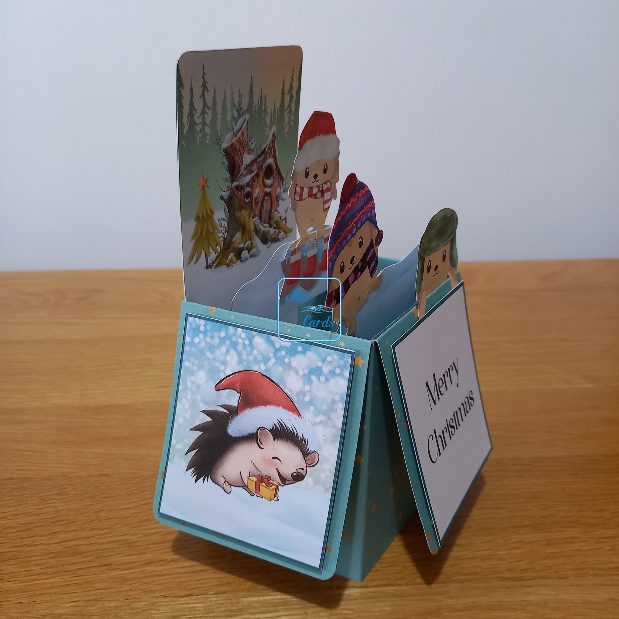 This is a ‘pop up’ box card with Christmas hedgehogs