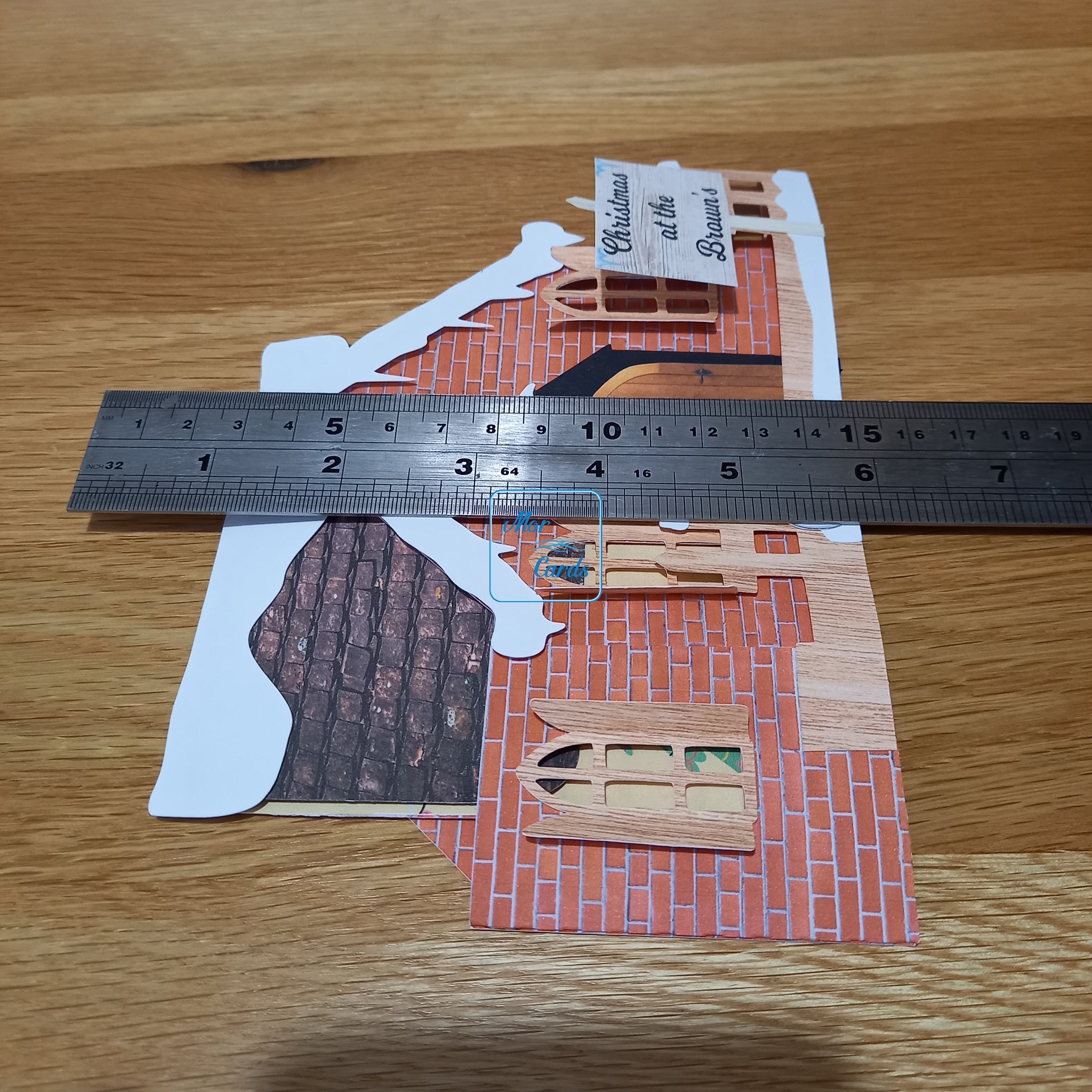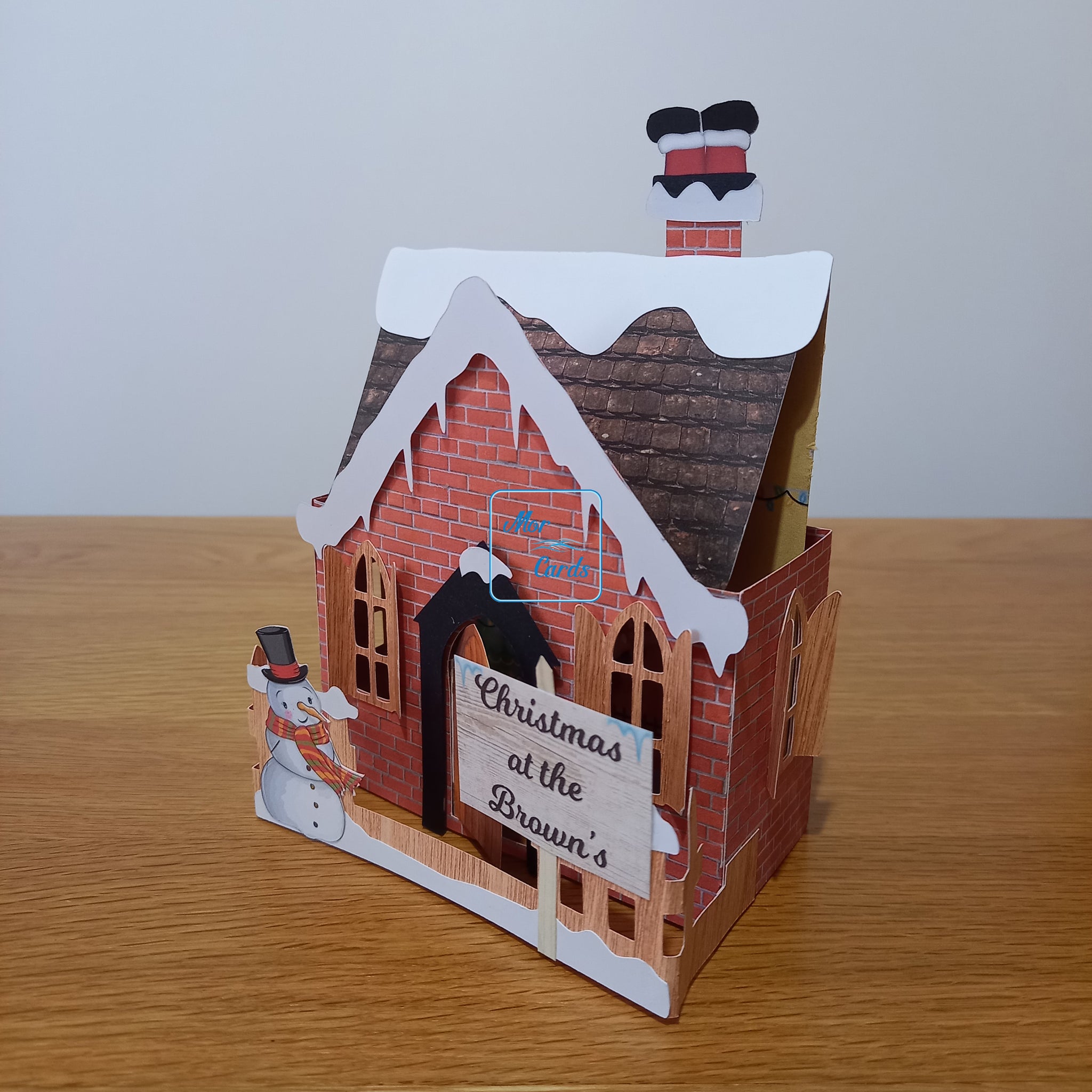 This is a ‘pop up’ box card of a Christmas house with a snowman outside and poor Santa is stuck in the chimney! Lift the roof and there's a cosy fire burning, the tree is decoarated and the stockings are hung.