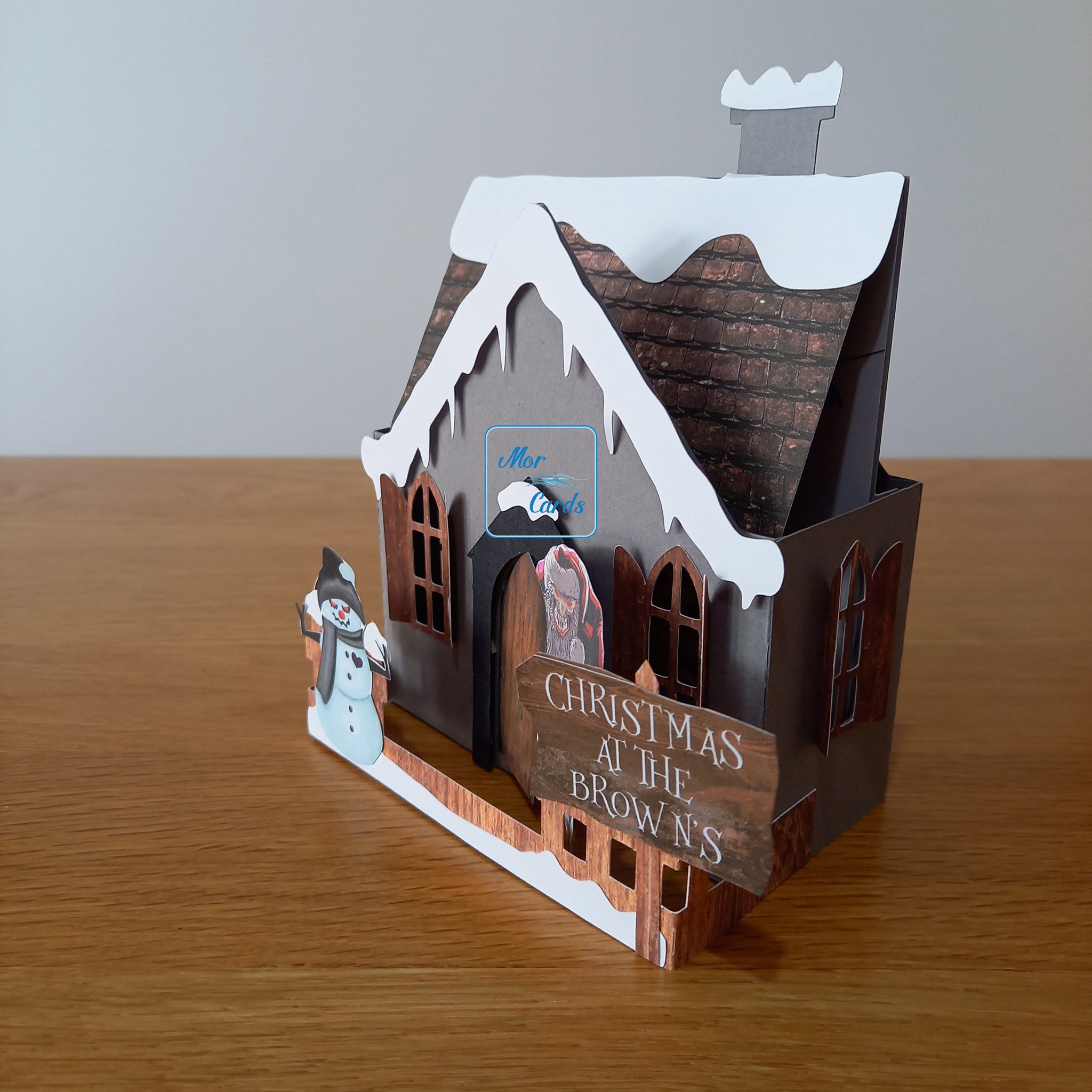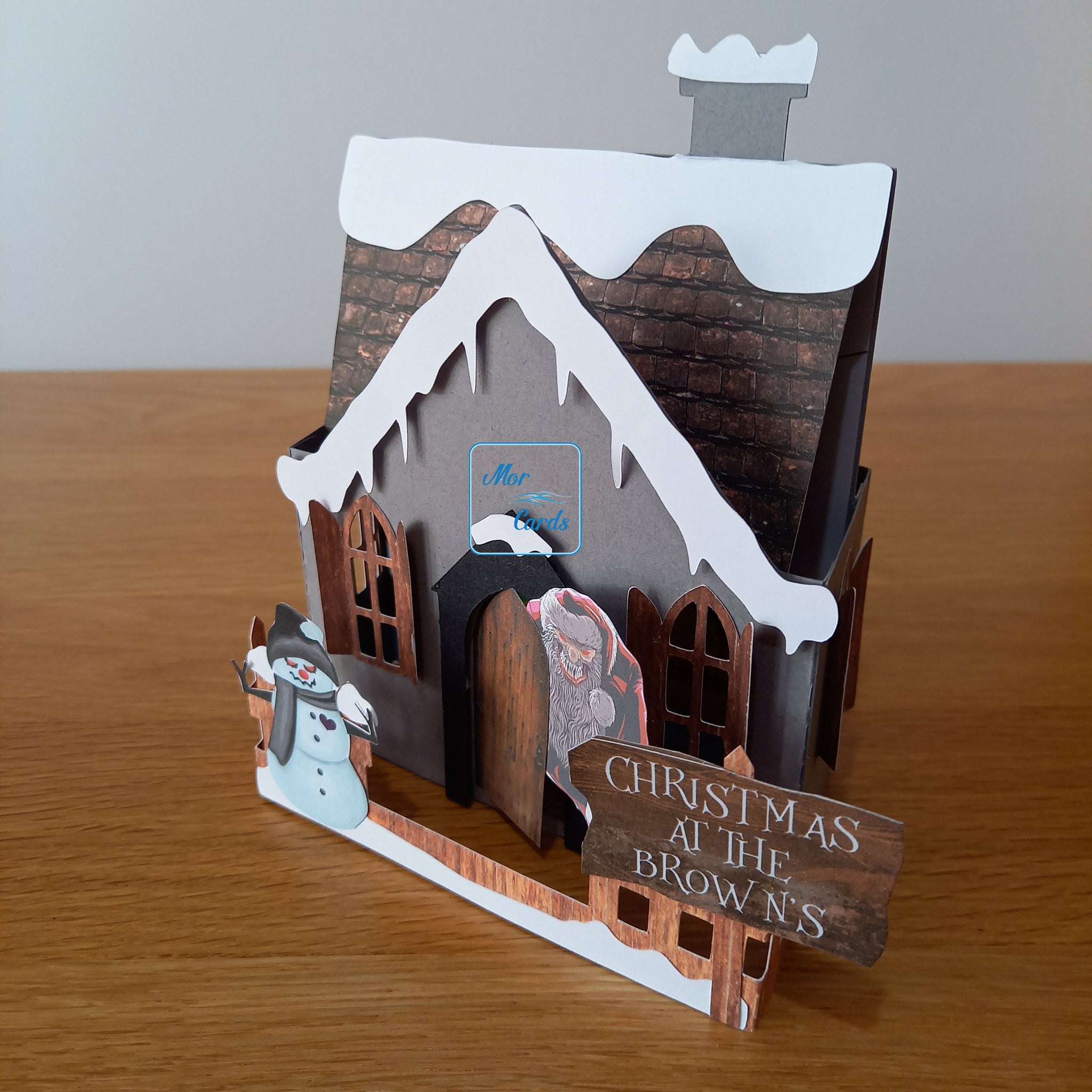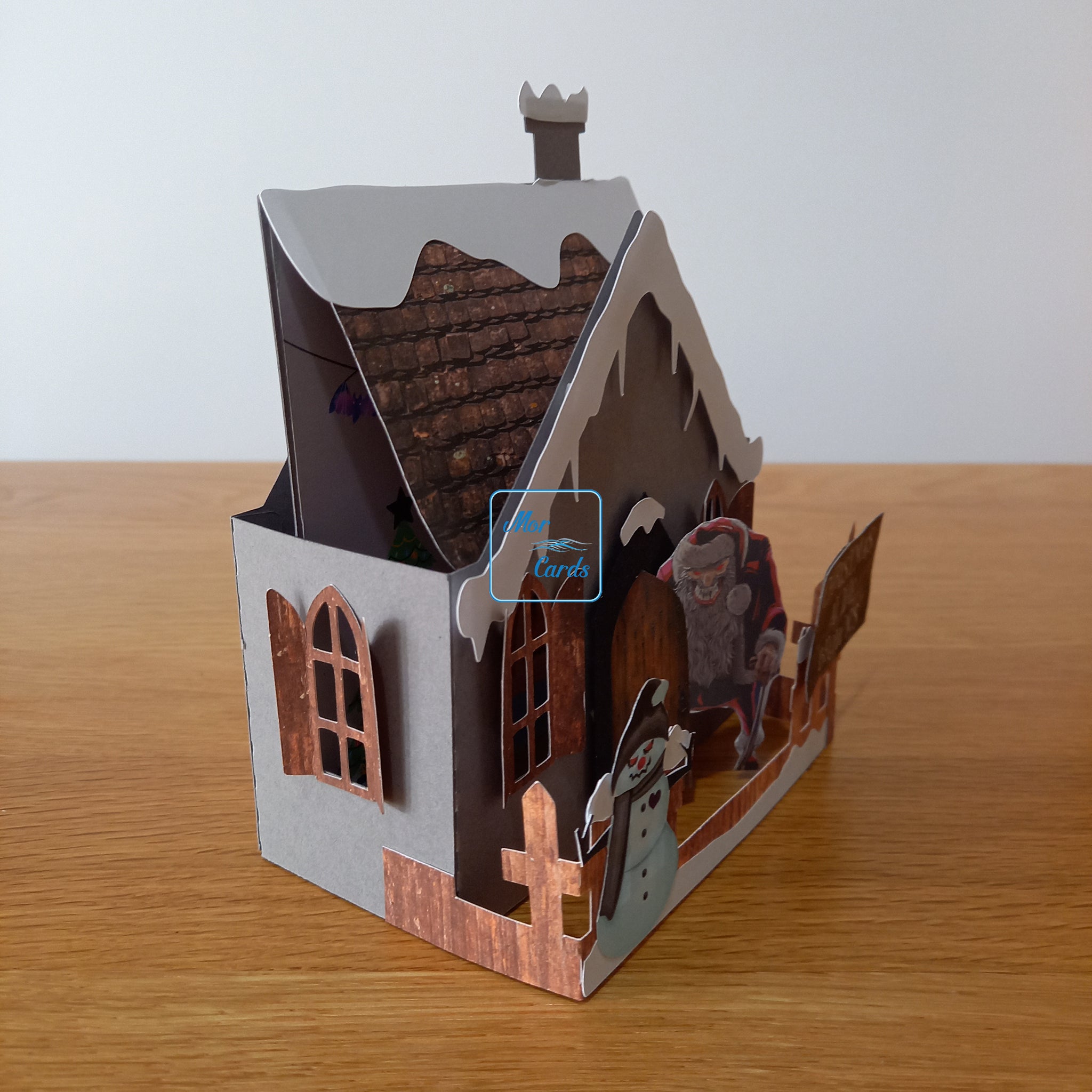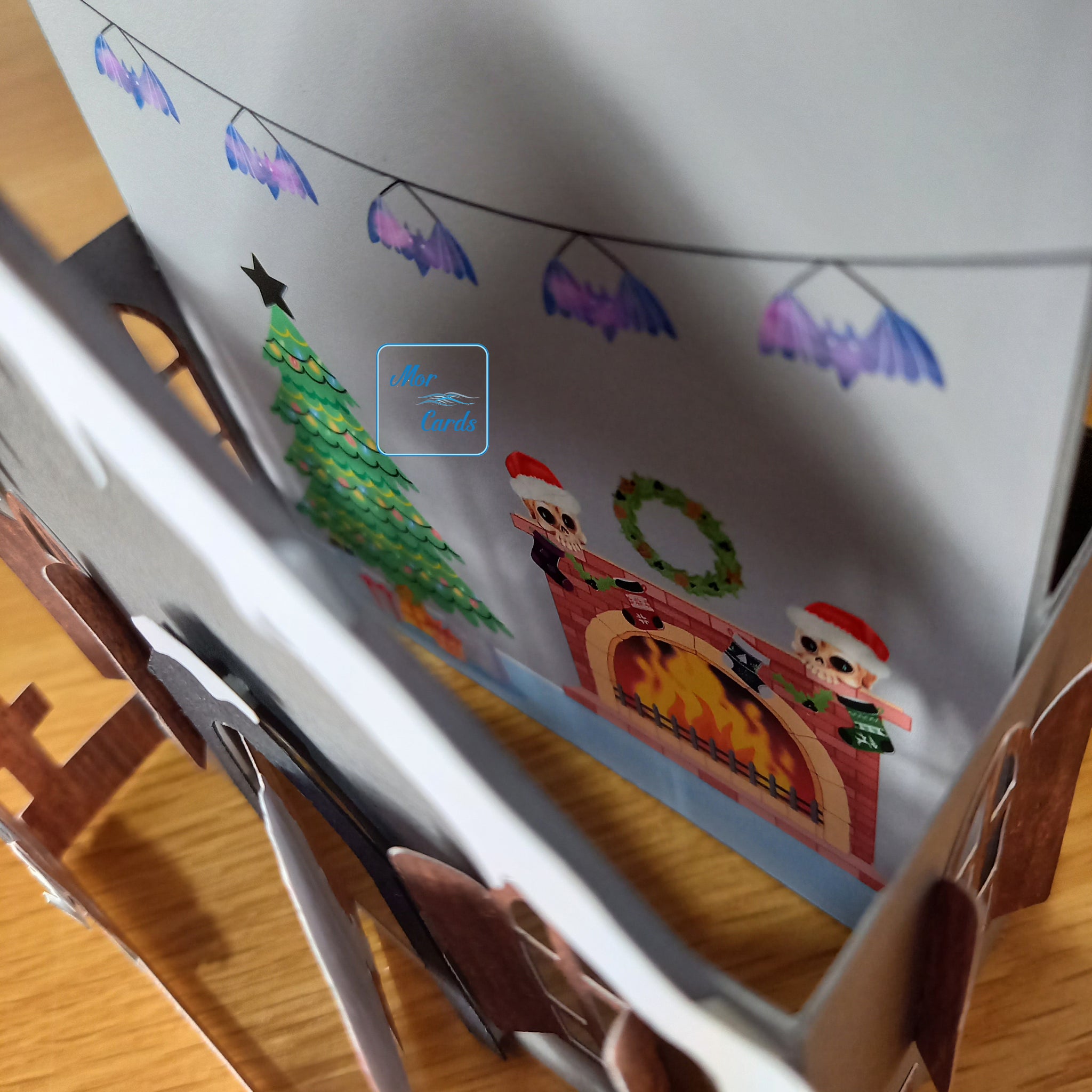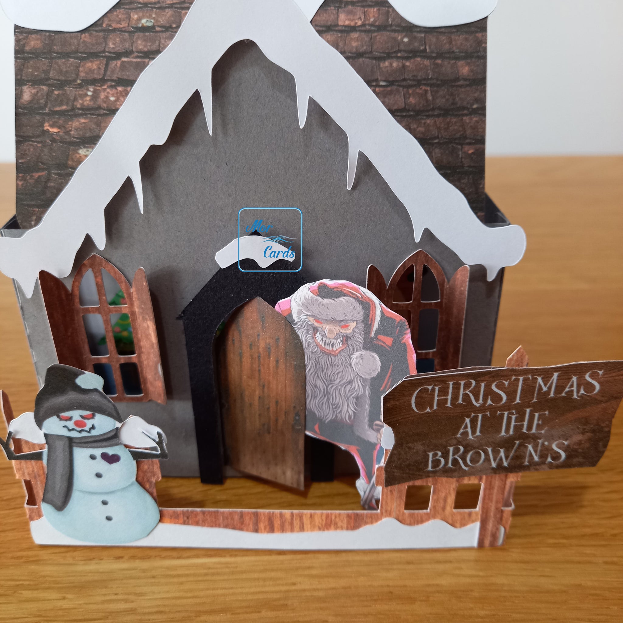 This is a ‘pop up’ box card of a spooky Christmas house with an evil Santa at the door, a nasty snowman outside and skulls on the fireplace inside! In addition to being a great alternative Christmas / Yule card, it is also perfect for a spooky house decoration for your mantlepiece or bookshelf!