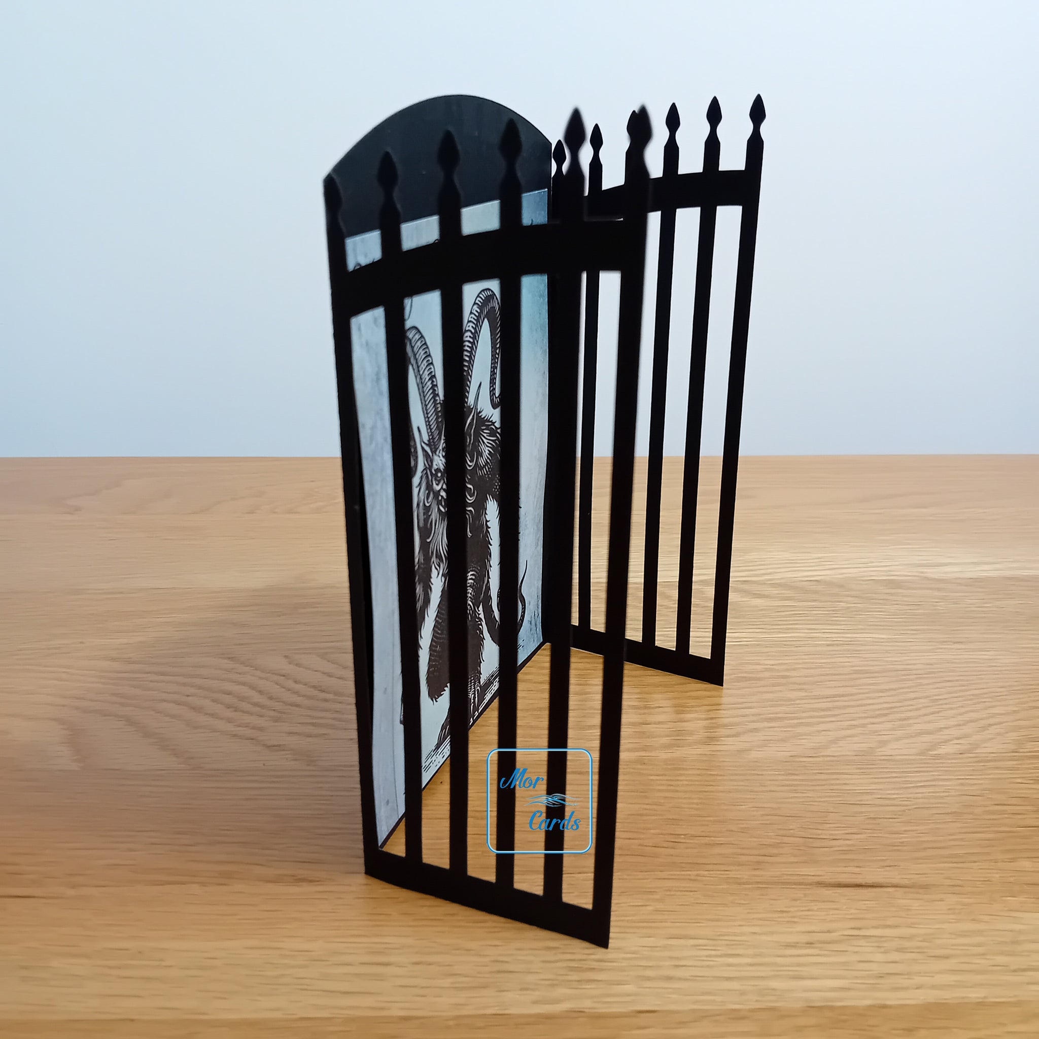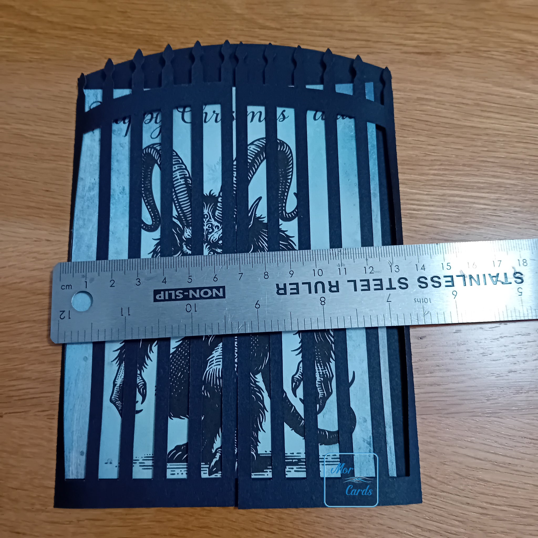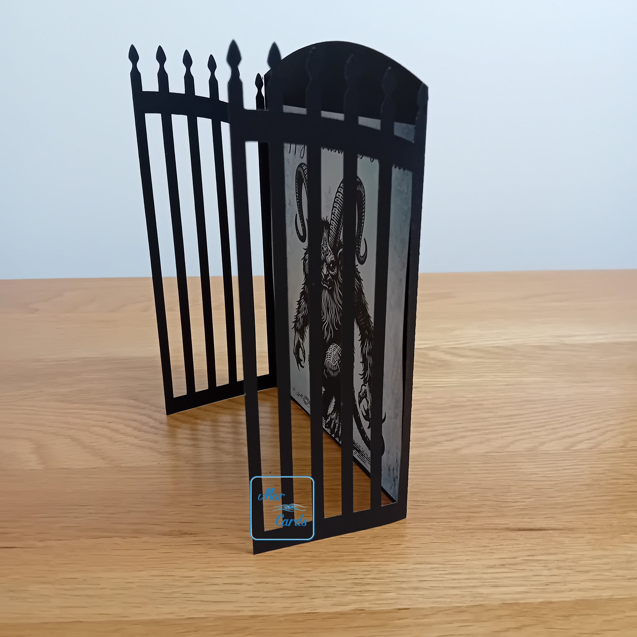 This is a gorgeous Gothic gatefold card with an ornate ribbon decoration. It shows Krampus and can be personalised for Yule or Christmas.