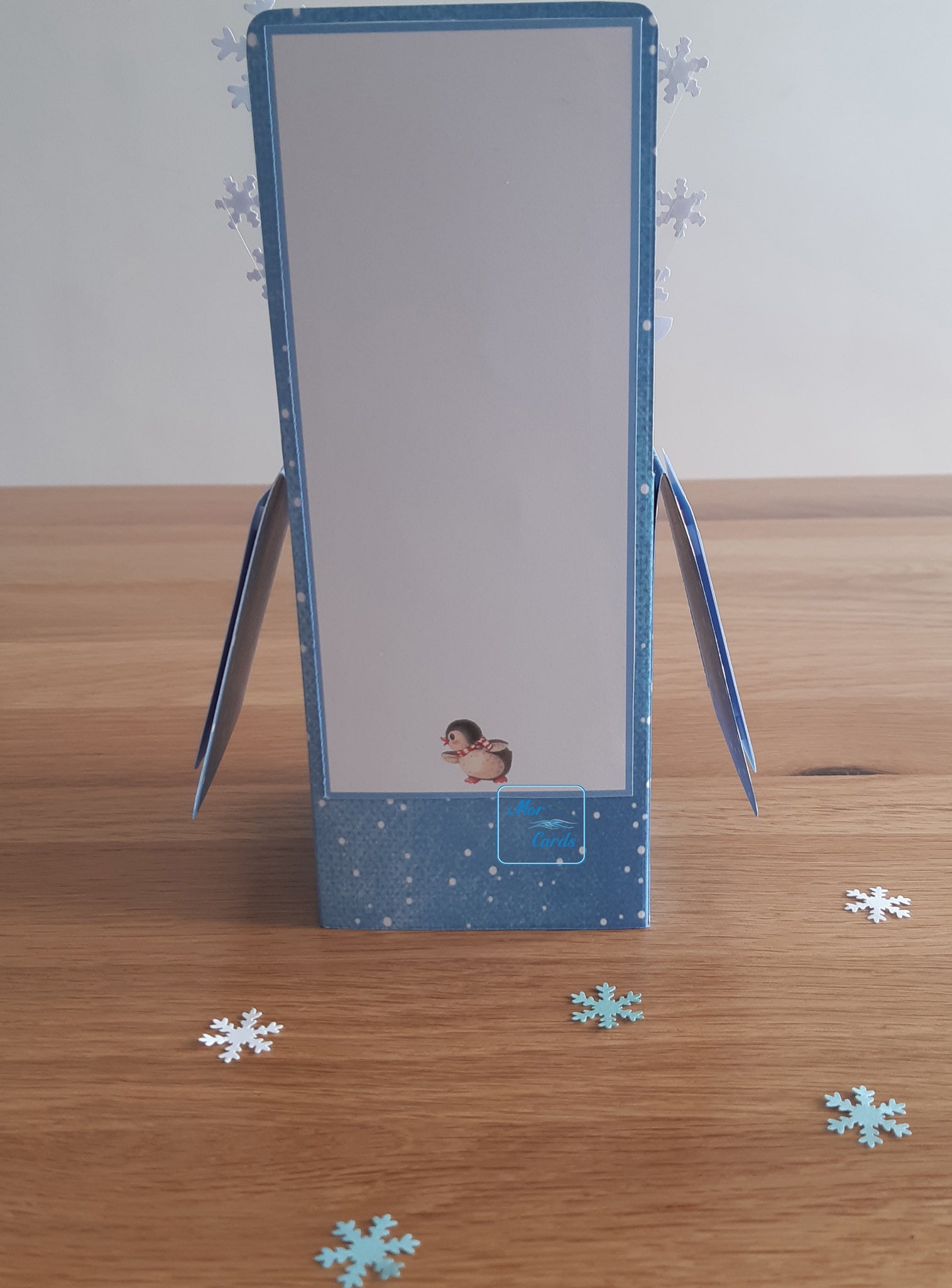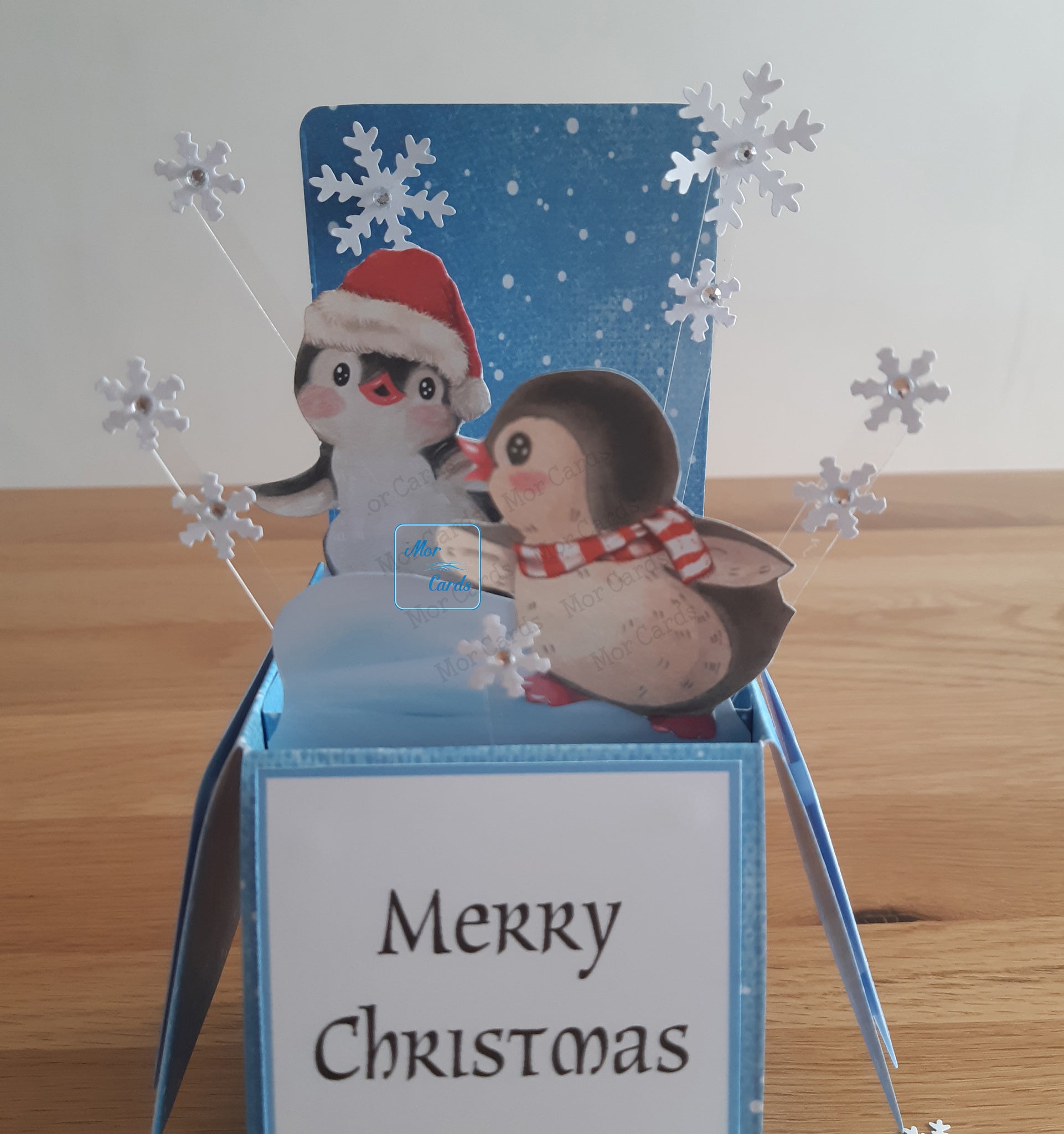 This is a ‘pop up’ box card with cute Christmas penguins and snowflakes.