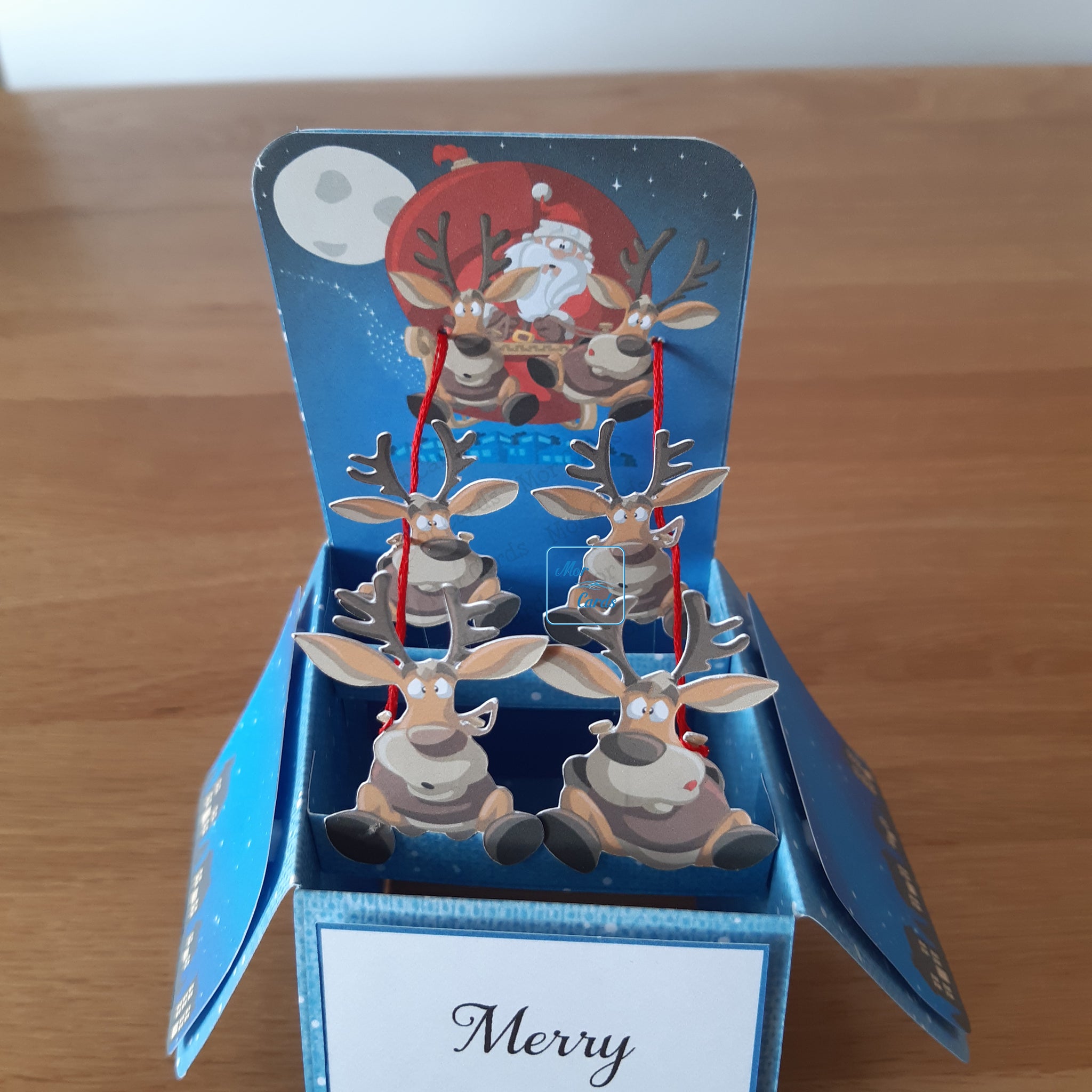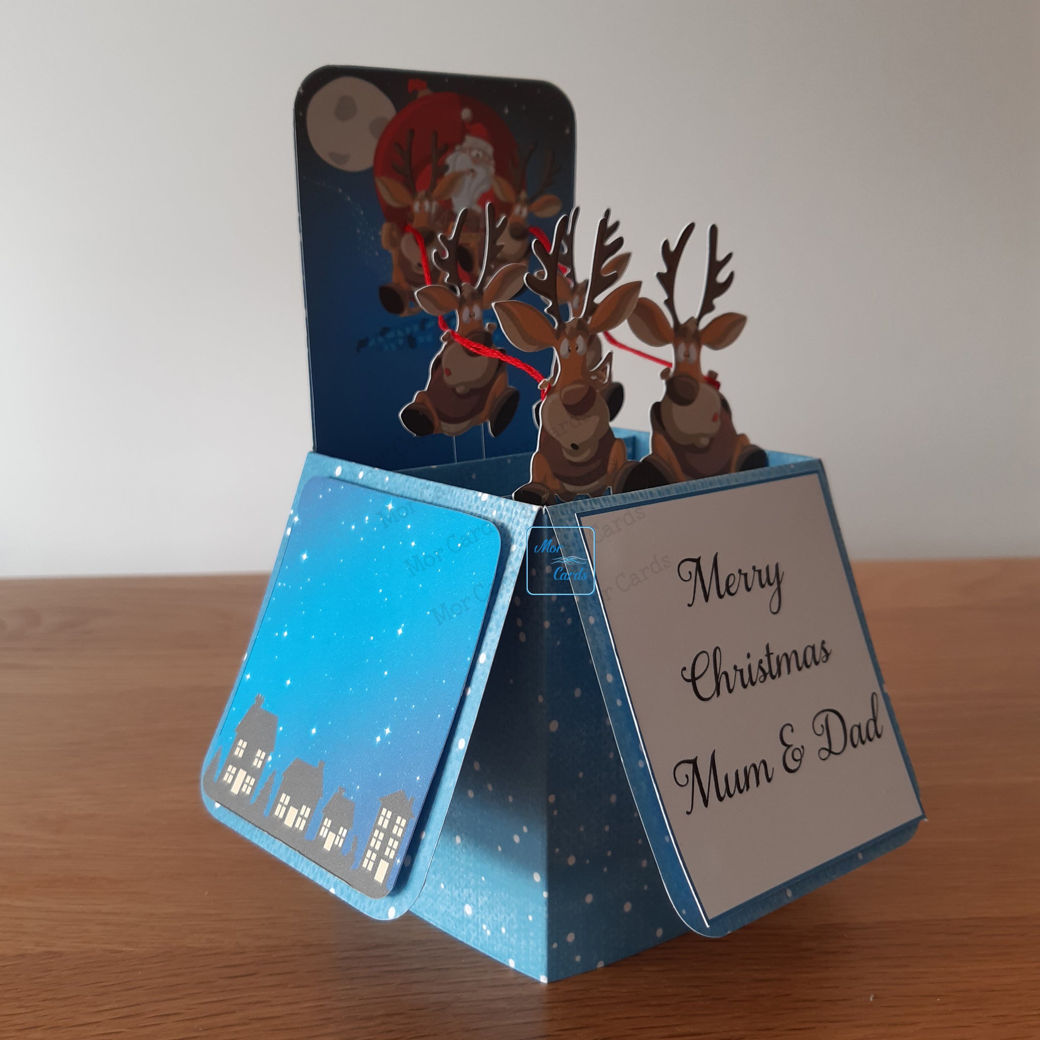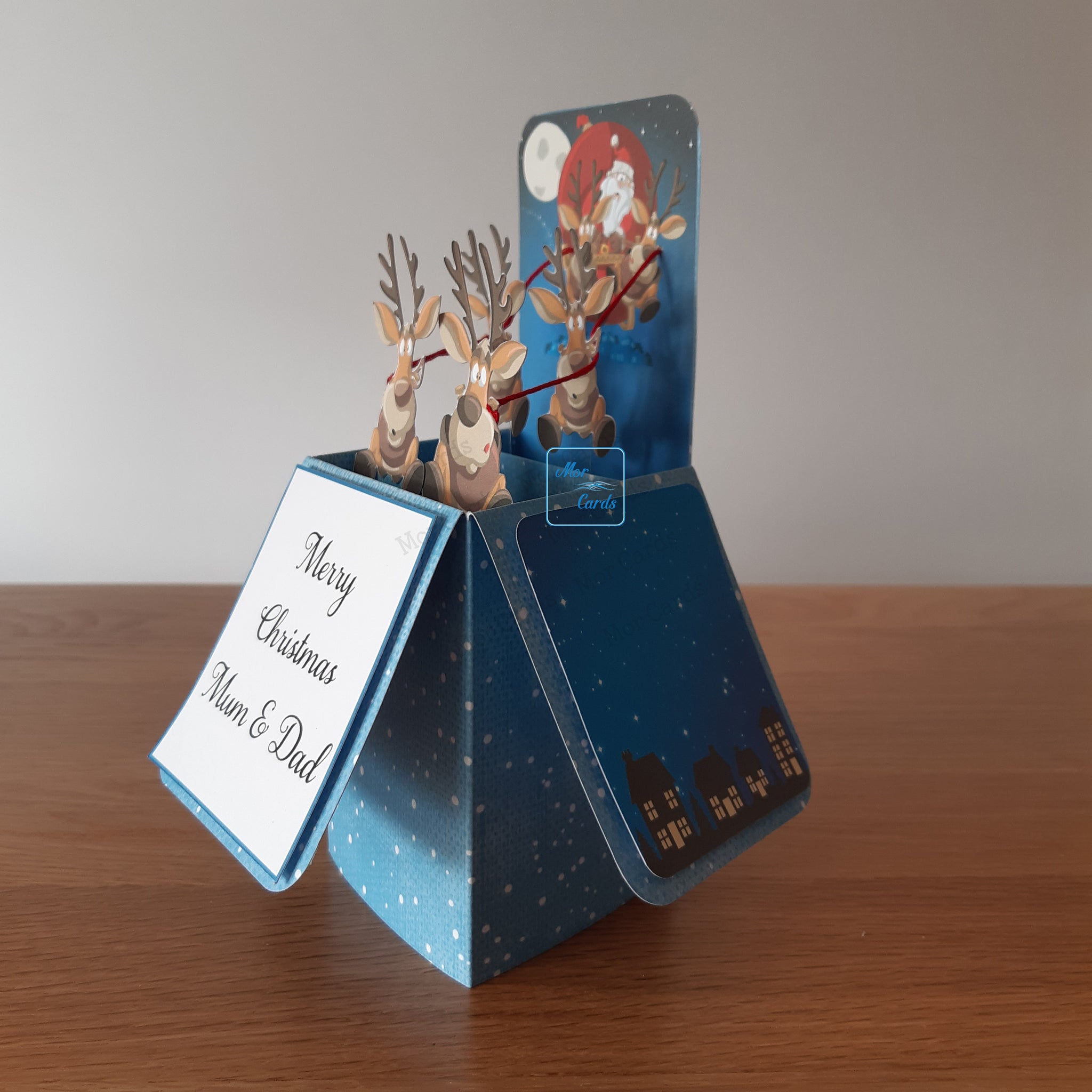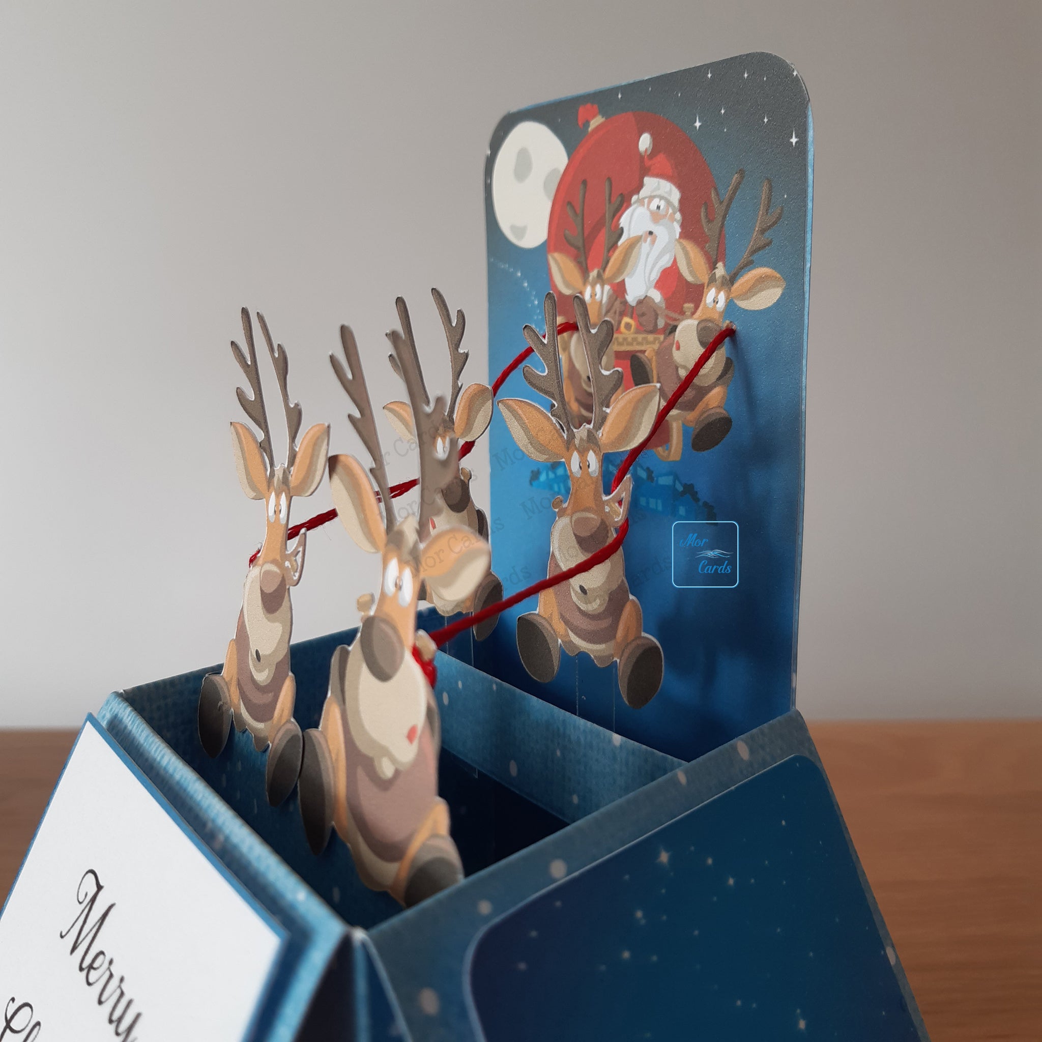This is a ‘pop up’ box card with cute Christmas characters - Santa and his flying reindeer pulling the sleigh.