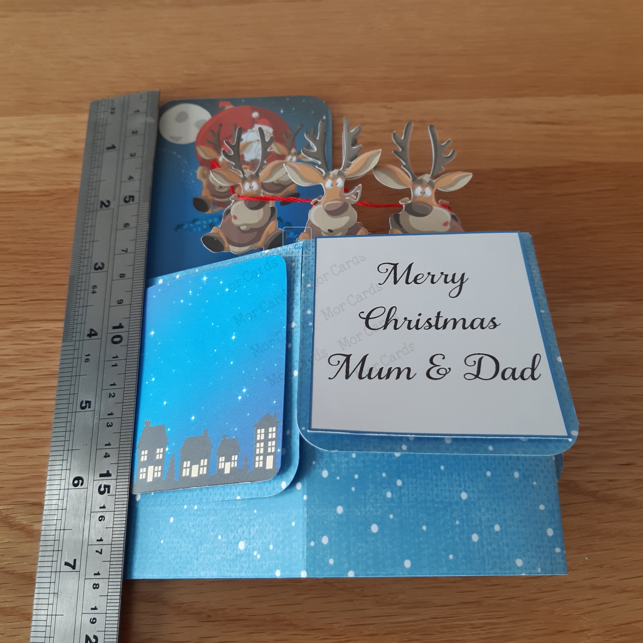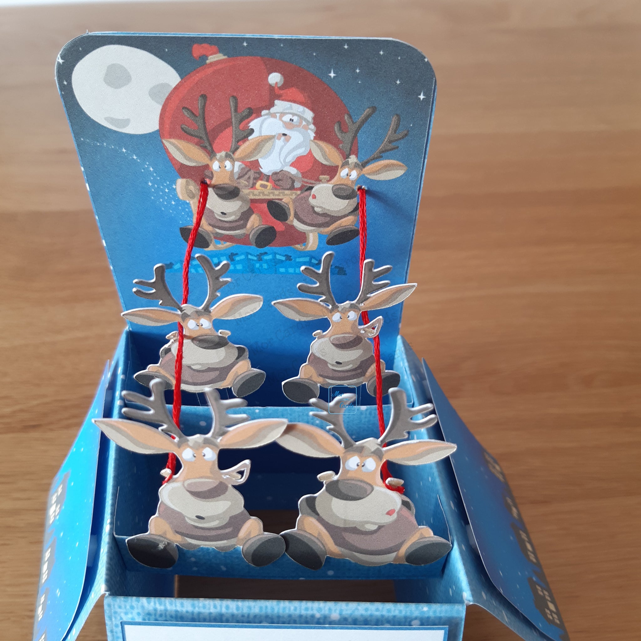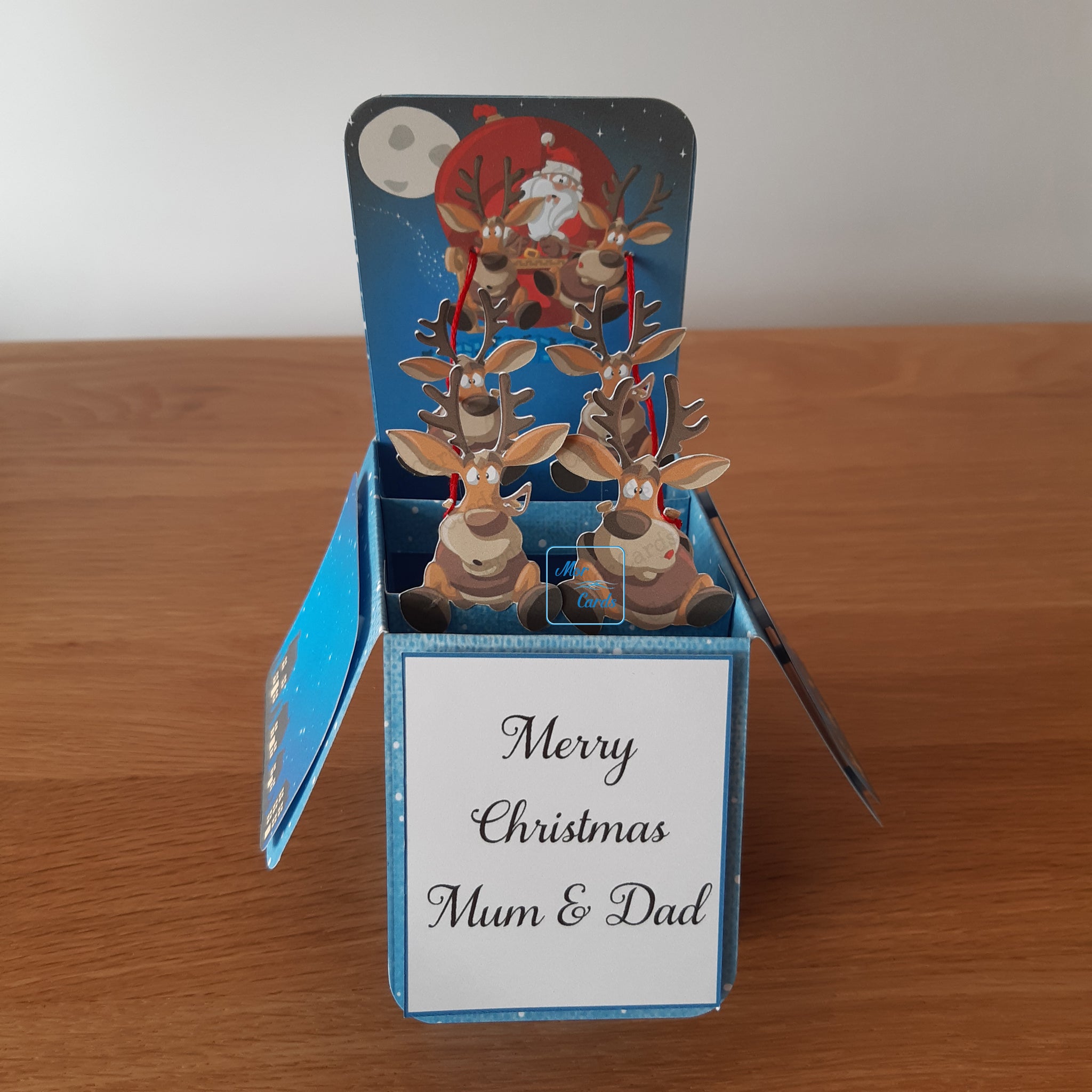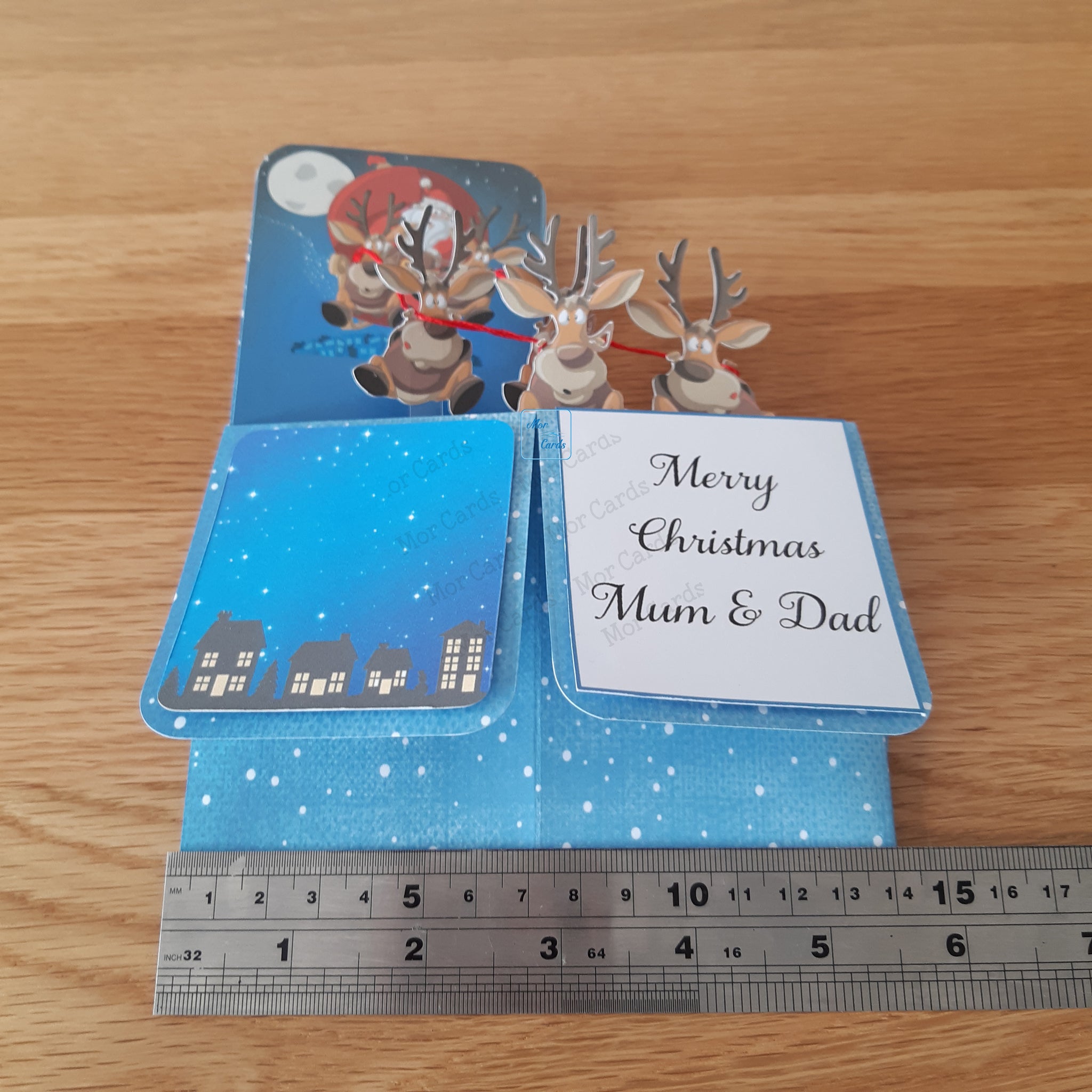 This is a ‘pop up’ box card with cute Christmas characters - Santa and his flying reindeer pulling the sleigh.