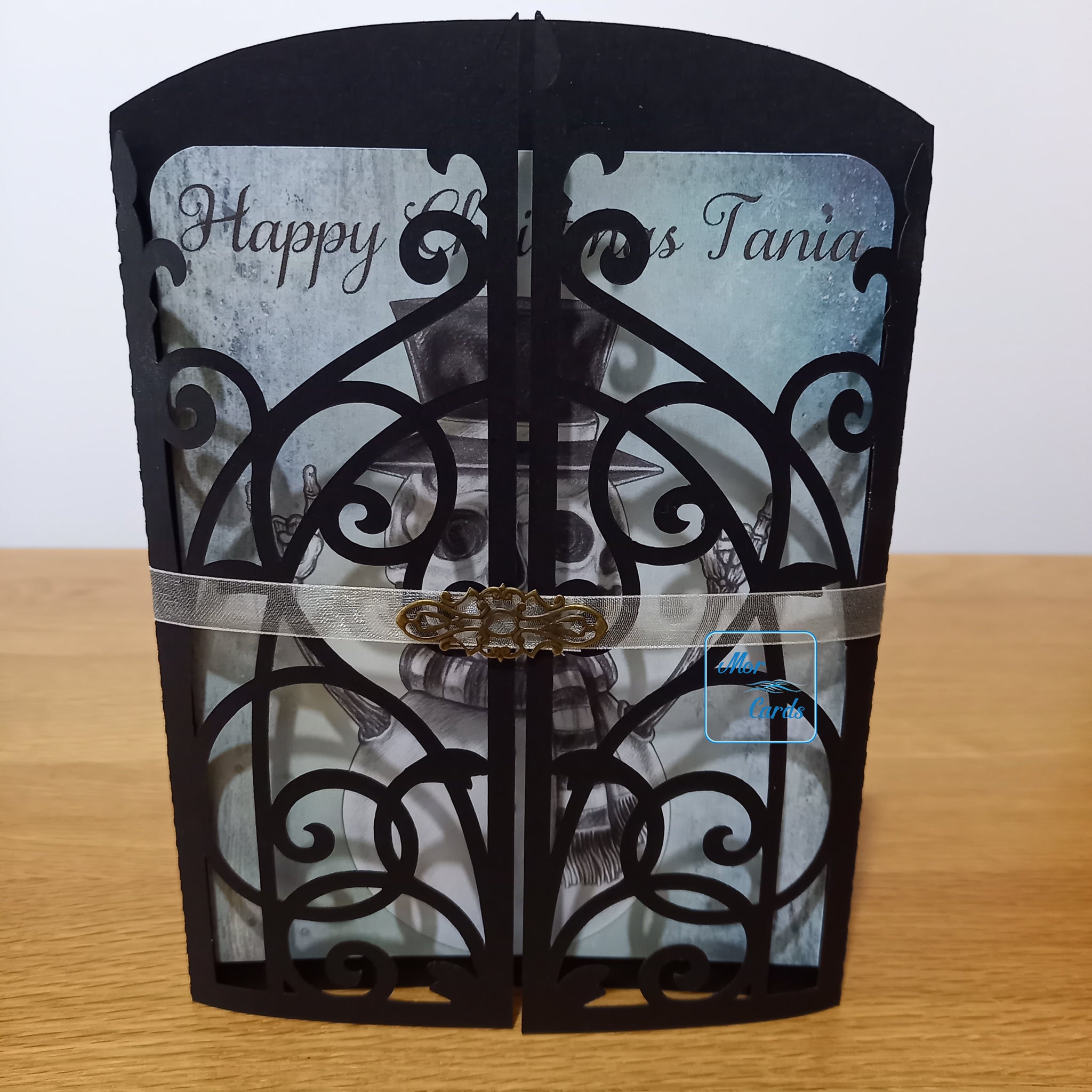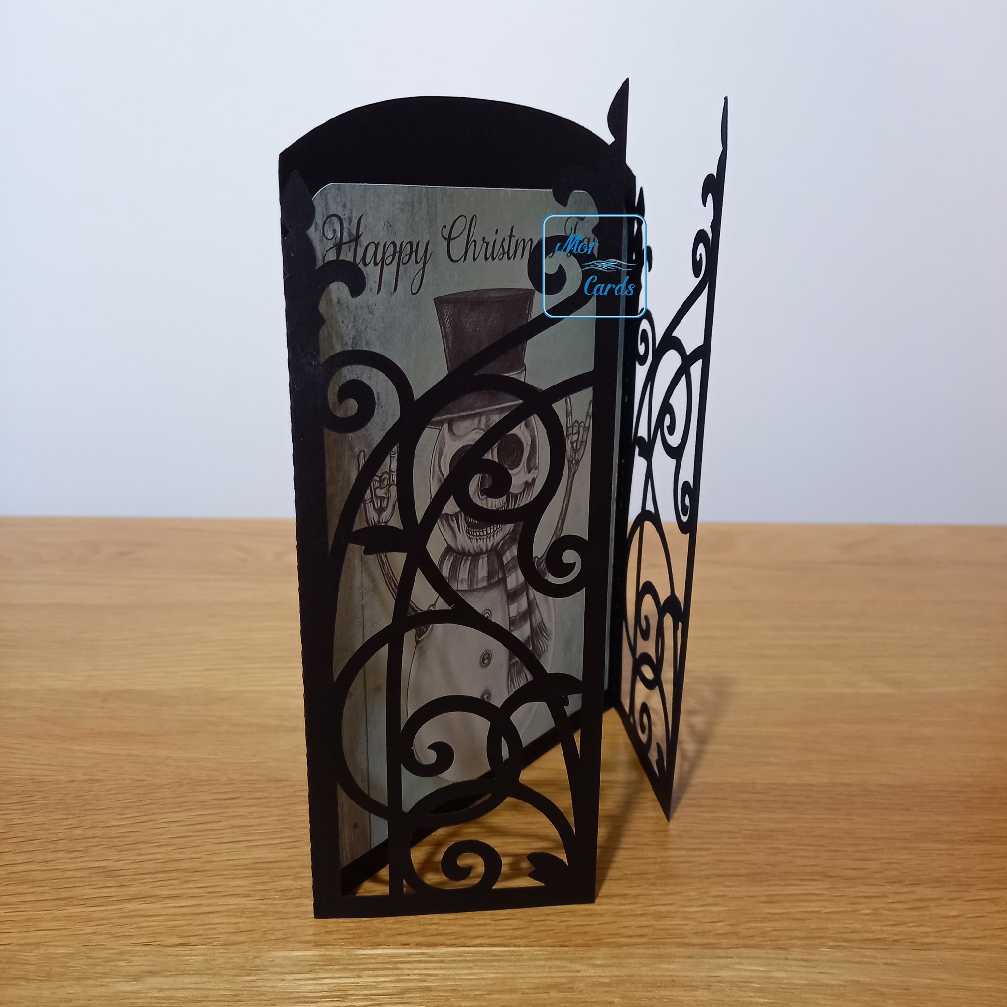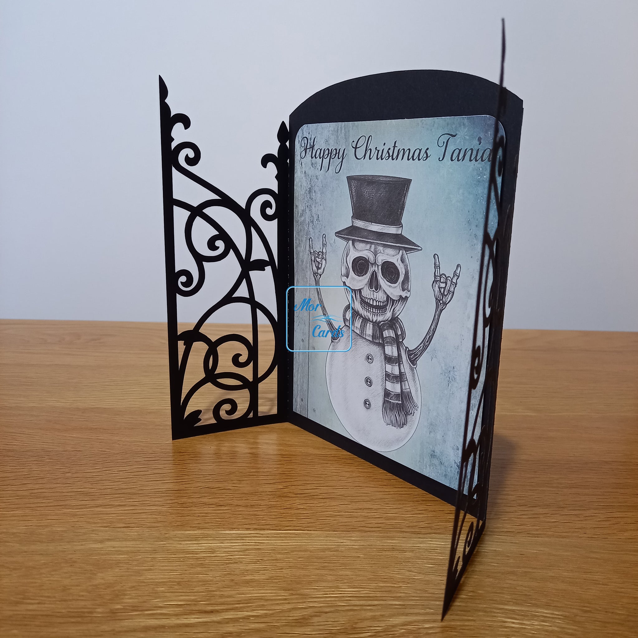 This is a gorgeous Gothic gatefold card with an ornate ribbon decoration. It shows a skull snowman and can be personalised for Yule or Christmas.